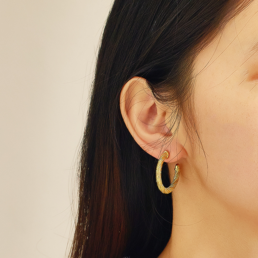 Die Ohrringe bestehen aus hochwertigem Edelstahl 316L als Grundmaterial, das sich durch hervorragende Korrosionsbeständigkeit, Verschleißfestigkeit und Zähigkeit auszeichnet und dafür sorgt, dass sich die zarte Webstruktur nicht leicht verformt oder beschädigt. Durch die Verwendung einer High-End-Vergoldungstechnologie wird die Goldschicht gleichmäßig und dicht auf der Oberfläche aufgetragen, mit fester Haftung und einer glatten Textur, und präsentiert einen edlen goldenen Glanz, der mit High-End-Edelschmuck vergleichbar ist. Die gewebte Textur wird mit professioneller Ausrüstung präzisionsgefertigt, mit klaren Linien und einem dreidimensionalen Sinn, der das kreative Konzept des Designers anschaulich interpretiert. Die Ohrringe werden einer strengen hypoallergenen Behandlung unterzogen, die schädliche Verunreinigungen entfernt, die zu Hautreizungen führen können, und so ein sicheres und angenehmes Tragen gewährleistet. Jedes Paar Ohrringe durchläuft mehrere Qualitätskontrollverfahren, um eine gleichbleibende Qualität sicherzustellen und den hohen Standards von edlem Modeschmuck gerecht zu werden.