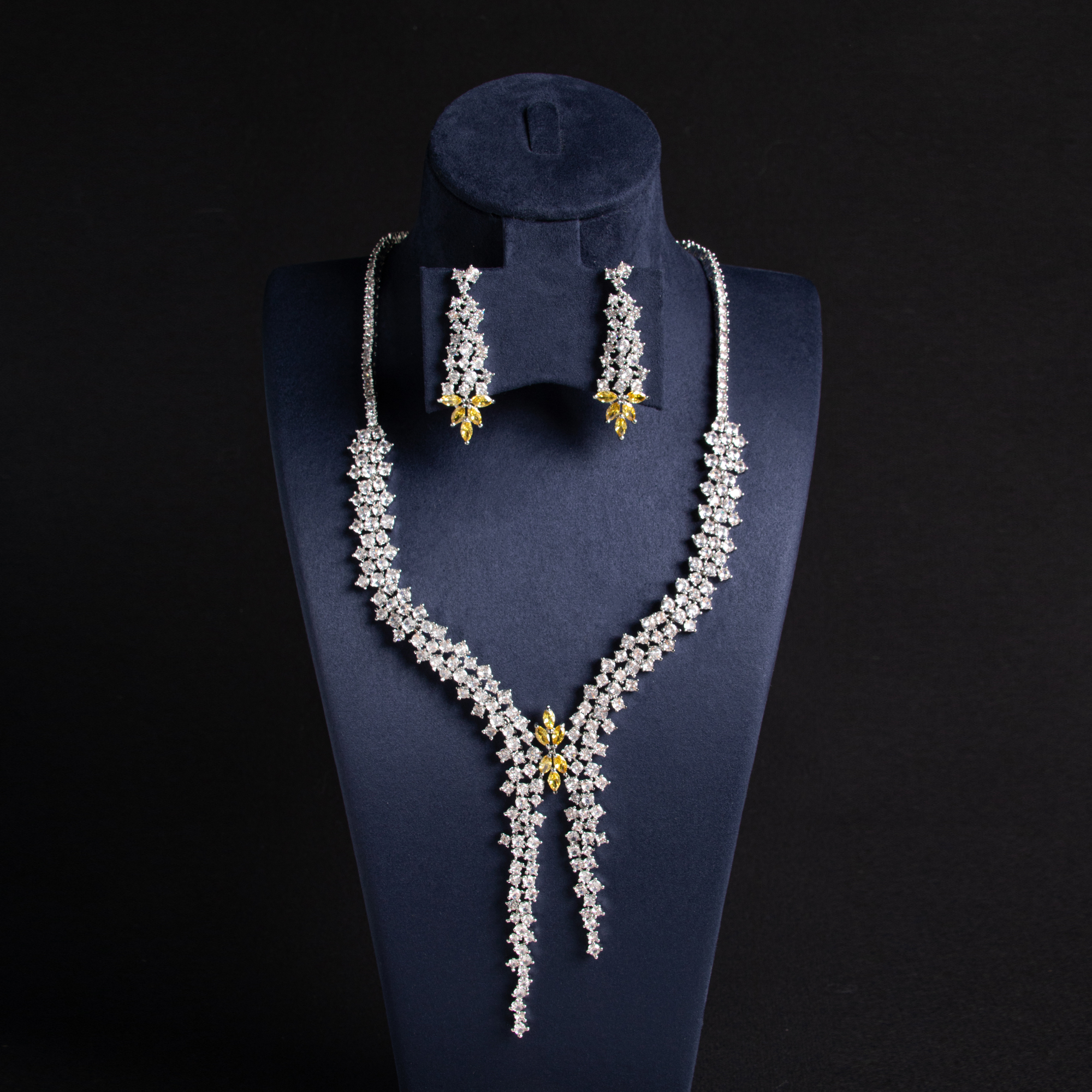 Available in stunning emerald or yellow citrine tones, the 18k gold plated brass emerald/yellow citrine tassel Y-drop necklace & earring set (wedding accessory) offers brides a luxurious finishing touch. Lonceen’s expertise in jewelry sets ensures every piece complements your style with sophistication.