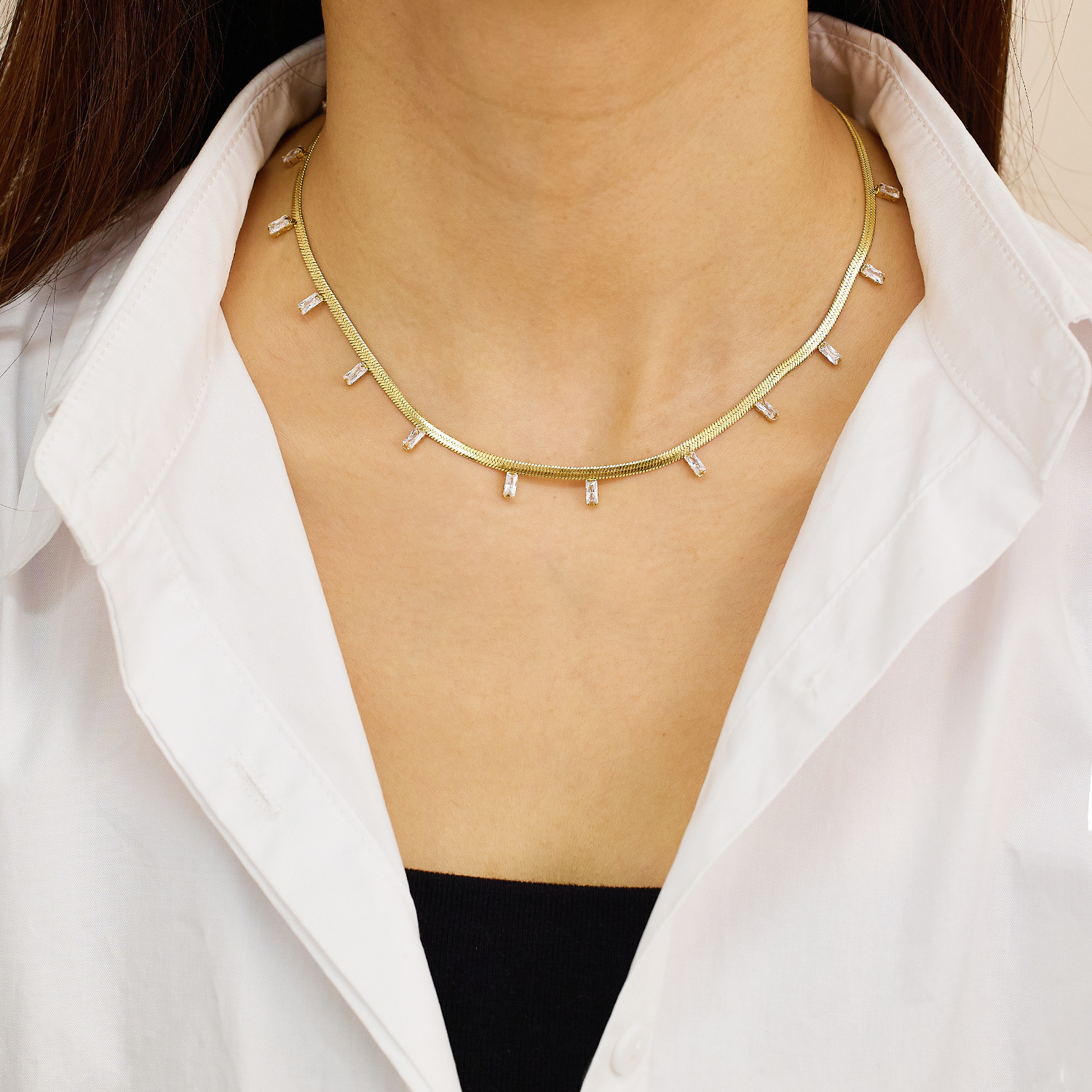 As a cost-effective and stylish wholesale jewelry piece, this 18k gold-plated zircon snake bone necklace is suitable for a wide range of bulk procurement scenarios, including jewelry stores, clothing boutiques, online e-commerce platforms and wedding accessory suppliers. For end consumers, it can be paired with evening gowns for cocktail parties or banquets to highlight noble temperament, matched with daily casual or office outfits to add a touch of delicate sparkle, and even used as a gift for festivals and anniversaries. The wholesale series supports flexible minimum order quantities, customized packaging and batch engraving services, meeting the diverse needs of bulk buyers for inventory replenishment and brand customization.