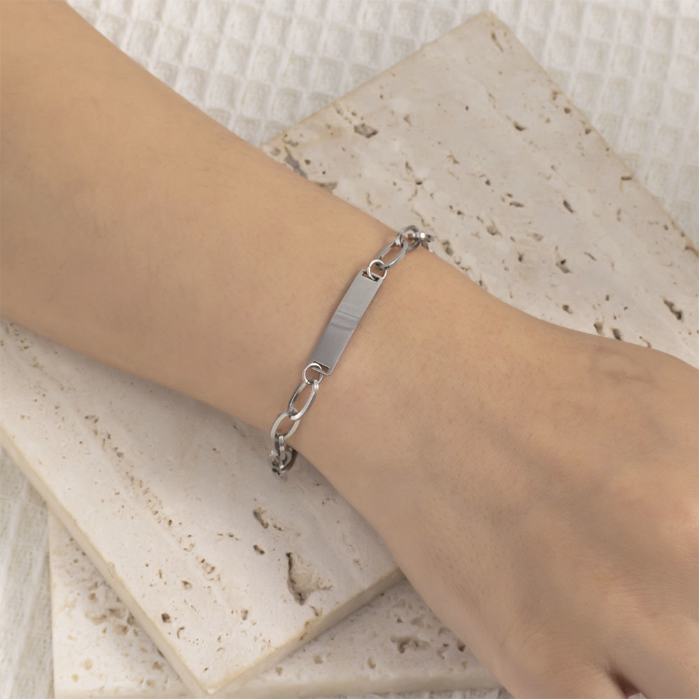 Crafted from high-grade stainless steel with a thick, uniform silver-plated coating, this fashion jewelry bracelet boasts an engraving-optimized blank surface and exceptional durability, tarnish resistance, and long-lasting luster. The silver-plated stainless steel base ensures structural sturdiness and scratch resistance, maintaining its bright silvery sheen without peeling or darkening even with prolonged daily wear. The blank pendant areas are pre-polished and coated with a special primer to ensure engraving clarity and prevent fading, while custom letter/name content is finished with high-precision laser engraving for crisp, permanent marks, delivering a comfortable and premium wearing experience.