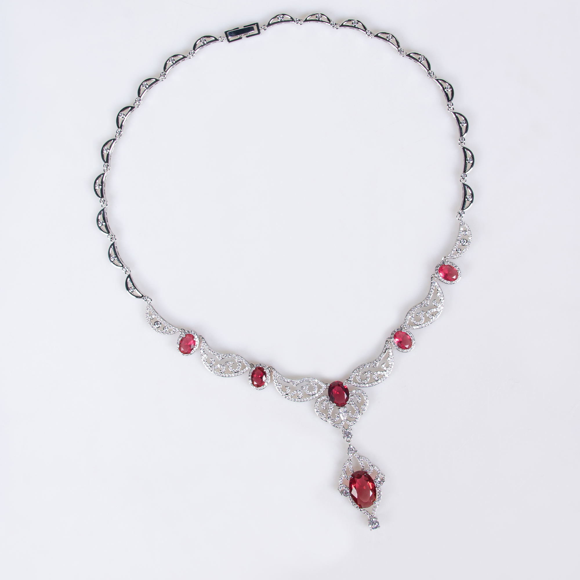 The Lonceen 18k gold plated brass ornate filigree gem pendant necklace set brings refined sophistication to wedding jewelry sets for brides. Crafted with precision, its red garnet or blue topaz teardrop centerpiece adds a vibrant touch to any bridal look.