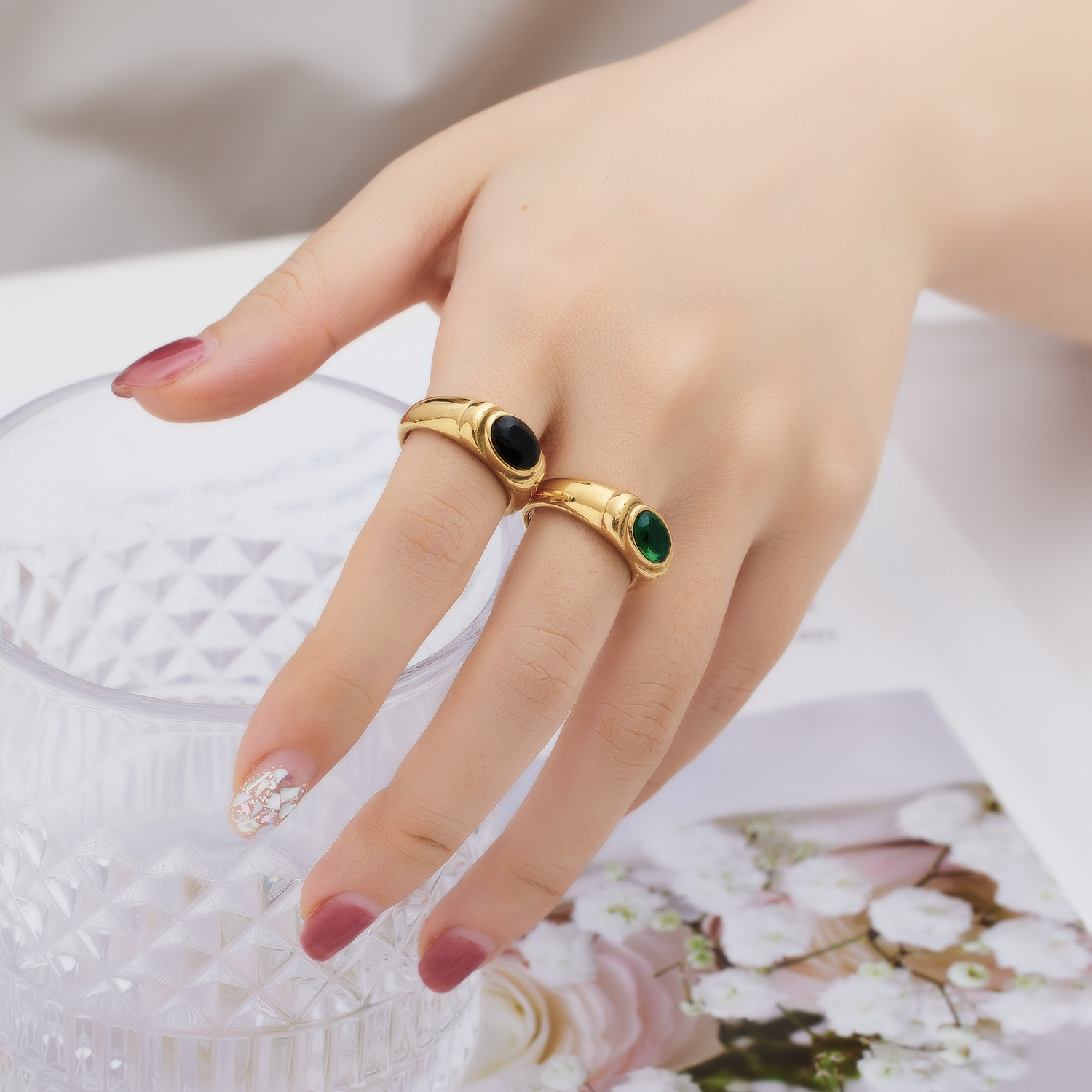 The Luxurious Green and Black Zircon Women's Stainless Steel Gold-Plated Fashion Jewelry Ring boasts an eye-catching design that combines luxury and sophistication. At its center, carefully selected green and black zircons are artfully inlaid in a precise setting, creating a striking color contrast that exudes unique charm. The zircons, with their excellent clarity and brilliant fire, mimic the allure of precious gemstones, while the sleek gold-plated band complements the stones perfectly, blending modern fashion sense with timeless elegance. Every detail of the ring is meticulously crafted, making it a standout accessory that catches the eye instantly.