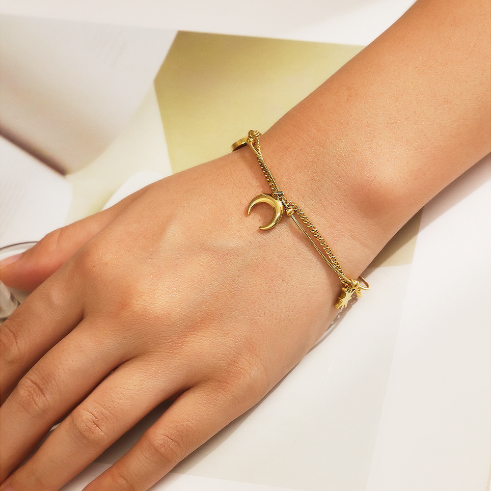 As a versatile multi-layer custom fashion jewelry piece, this 18k gold-plated non-oxidizing stainless steel bracelet can be seamlessly paired with office formal wear, romantic dating outfits, evening party gowns, and casual street-style ensembles. Its adjustable clasp ensures a comfortable and secure fit for different wrist sizes, and the layered design adds a sense of sophistication and trendiness to any look, whether worn alone as a statement piece or matched with other delicate jewelry for a more elaborate style. It also serves as a thoughtful and personalized gift for birthdays, anniversaries, or festivals.