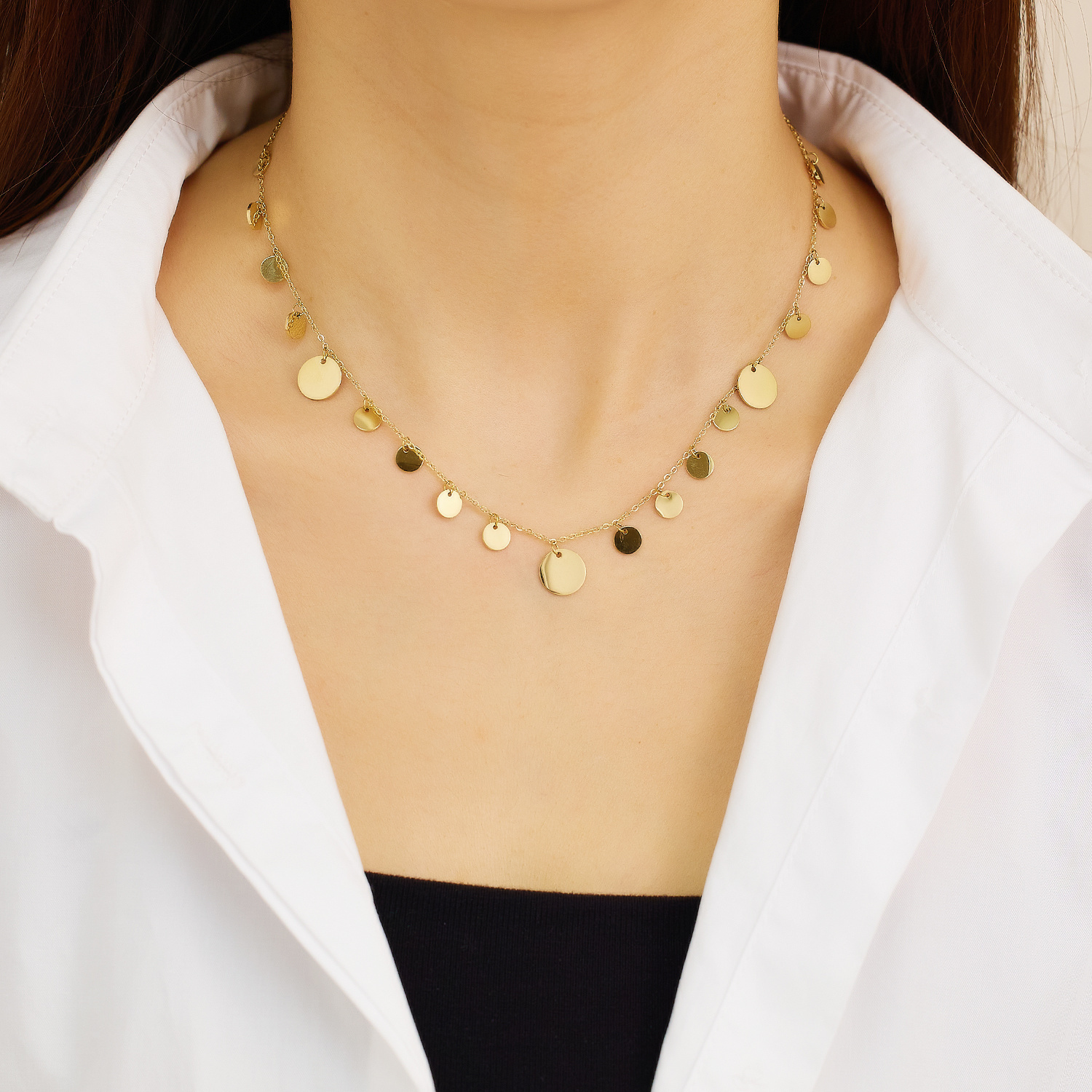 As a popular minimalist retro jewelry piece, this 18k gold-plated small round necklace is suitable for a wide range of scenarios. For daily campus or office wear, it pairs seamlessly with white T-shirts, knitted sweaters, or chiffon blouses to add a touch of sweet retro elegance; for weekend dating or afternoon tea, it complements denim overalls, vintage floral dresses, or pleated skirts to enhance the charming girlish temperament; for retro-themed parties or family gatherings, it serves as a subtle yet eye-catching accessory that showcases unique taste. It is also an ideal gift for girlfriends, sisters, or female classmates on birthdays, festivals, or graduation ceremonies, conveying sincere care and sweet blessings.