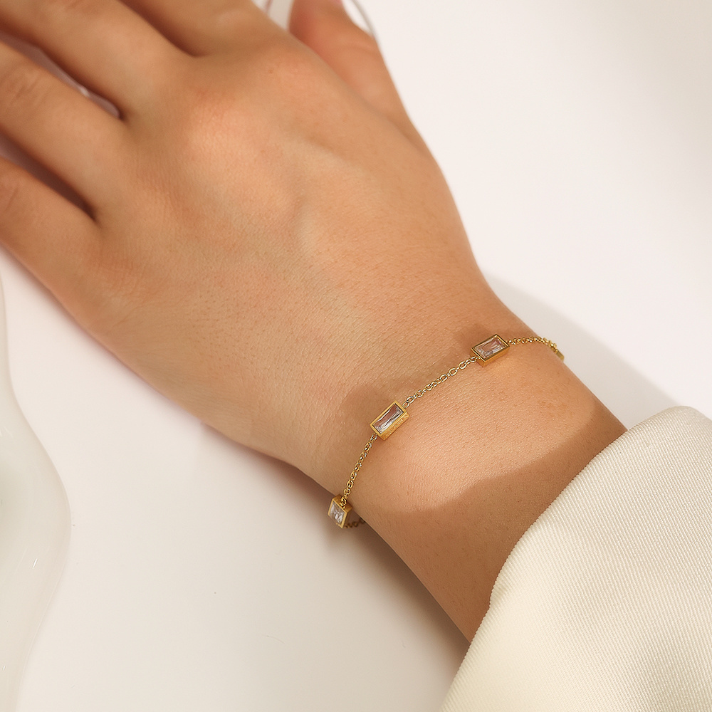 Crafted from high-grade stainless steel with a thick, uniform 18k gold-plated coating and embedded with top-tier rectangular cubic zirconia, this women's bracelet boasts exceptional durability, tarnish resistance, and long-lasting radiance. The stainless steel base ensures structural sturdiness and scratch resistance, maintaining its shape even with prolonged daily wear, while the 18k gold plating retains its luxurious luster without fading or peeling. The selected rectangular zircons feature high clarity and excellent light refraction, presenting a unique geometric sparkle that is more distinctive than round stones, bringing a high-end and modern visual experience.
