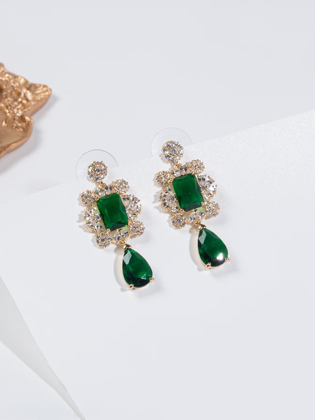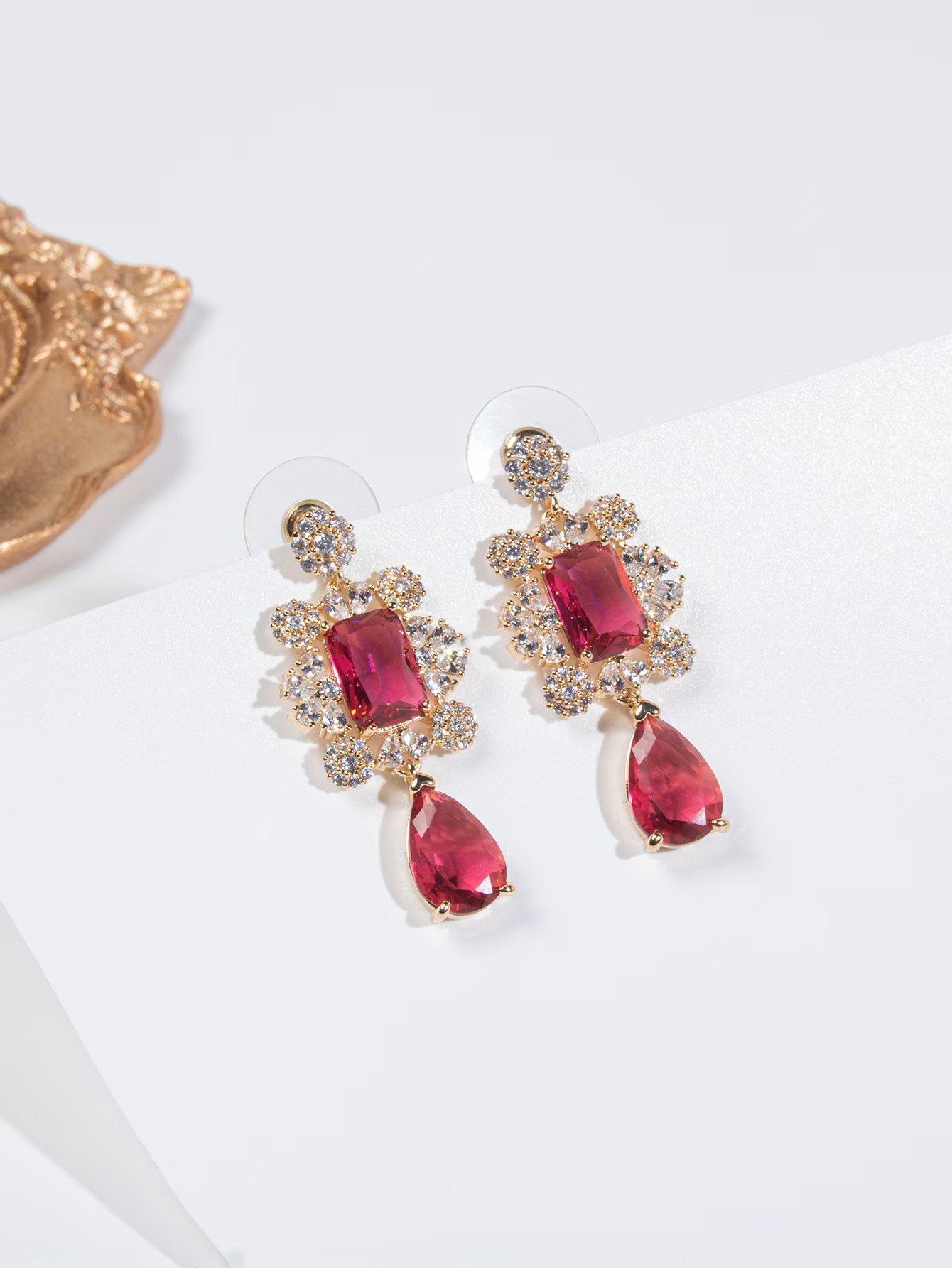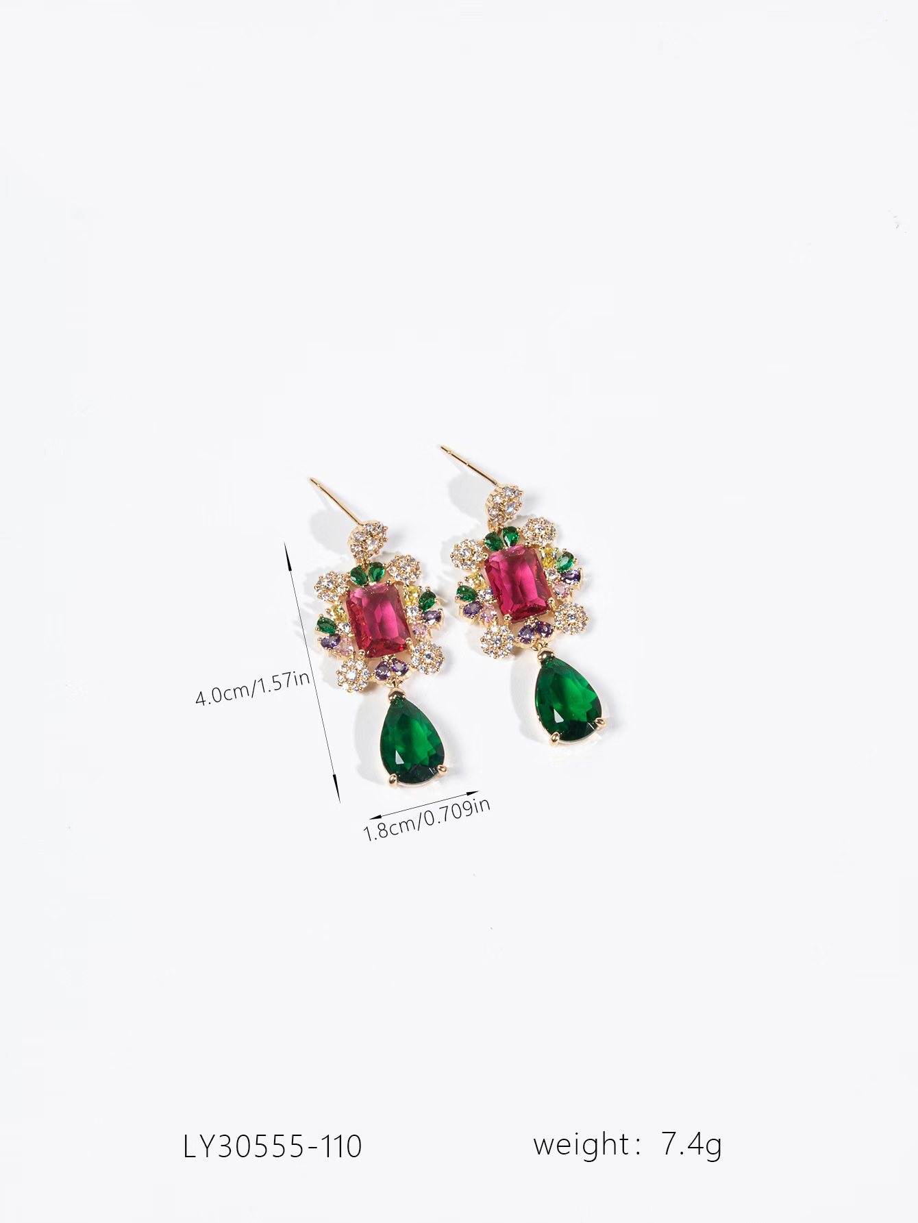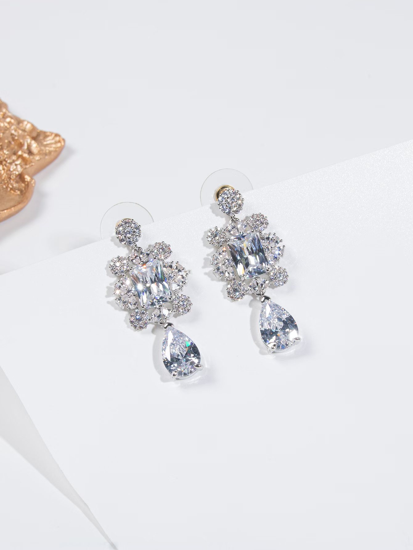 Cada par, elaborado para brindar brillo, presenta vibrantes piedras de circón en forma de lágrima en cascada. Los pendientes colgantes en forma de lágrima con piedra central cuadrada de circonita cúbica multicolor resaltan la elegancia adecuada para joyas nupciales formales de boda o para uso diario elegante.