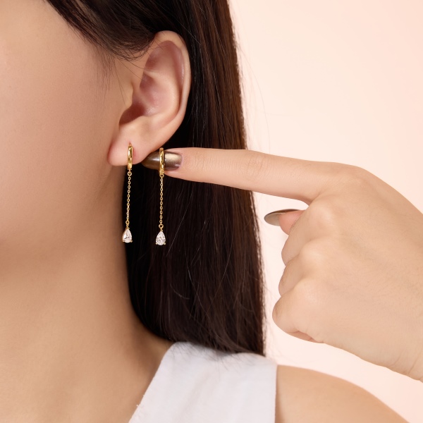 Ces boucles d'oreilles en argent plaqué or 18 carats (S925) sont ornées de deux puces d'oreilles en zircon en forme de larme et d'une élégante chaînette. L'éclat du zircon leur confère une brillance incomparable, les rendant parfaites au quotidien comme pour les grandes occasions.