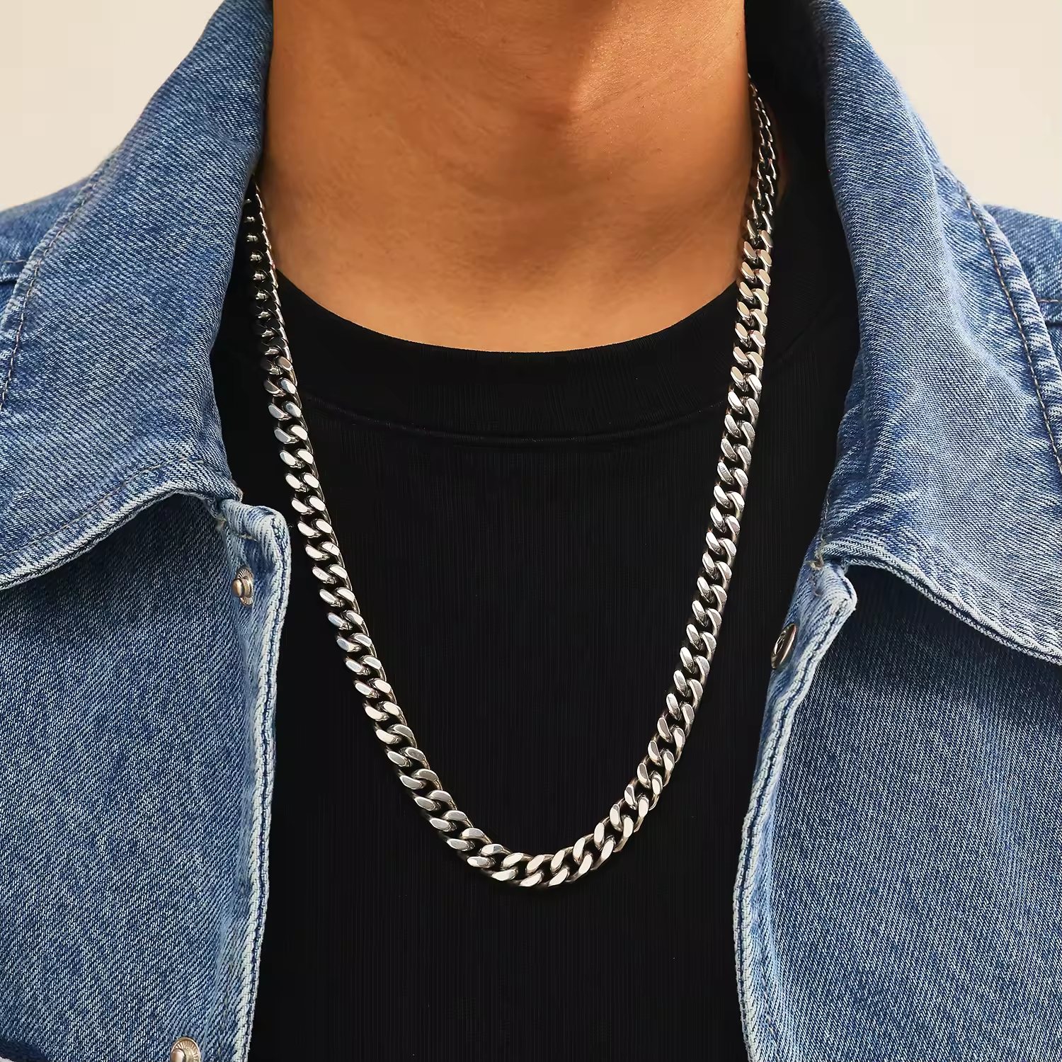 Collier pour homme de haute qualité, style hip-hop, maille cubaine, acier inoxydable plaqué or 18 carats, couleur argent.