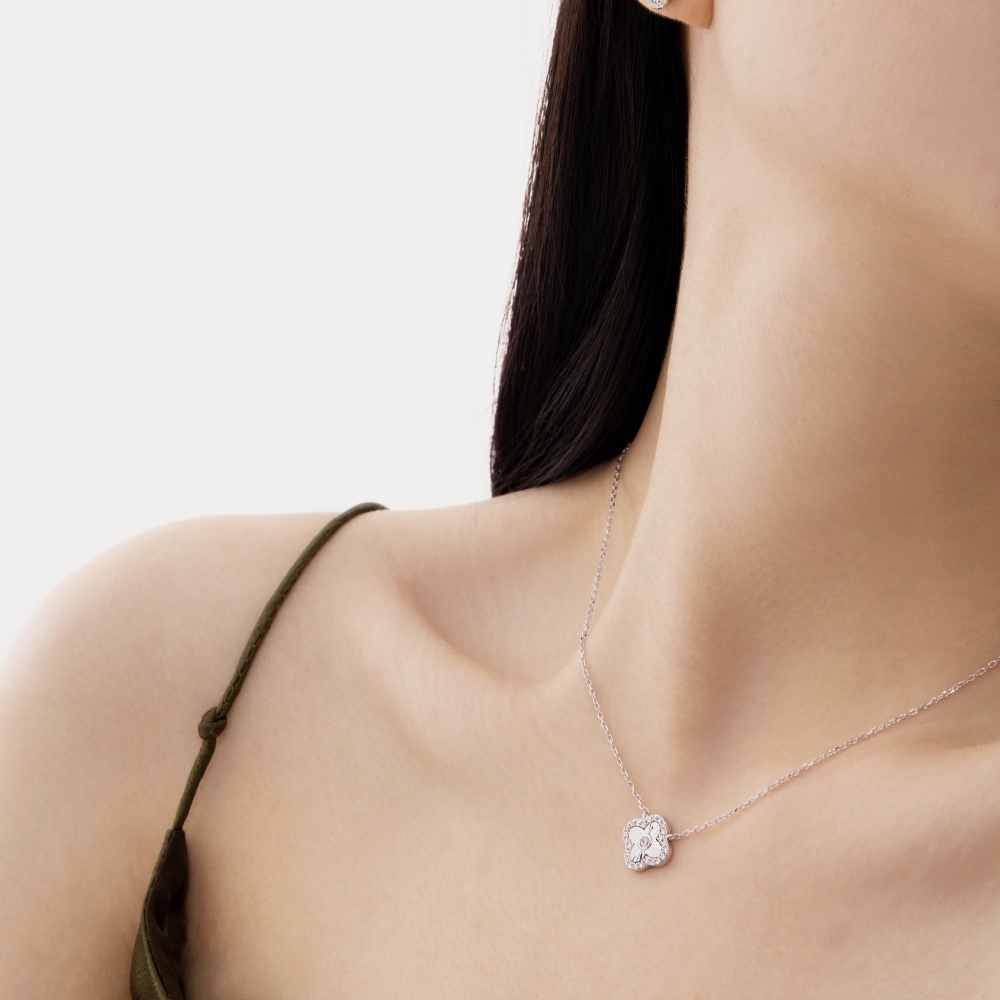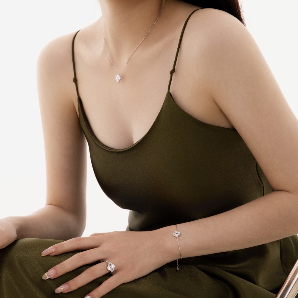 Inspiré du trèfle à quatre feuilles, ce collier en moissanite présente une structure creuse qui amplifie la réflexion de la lumière tout en conservant un profil moderne et équilibré.