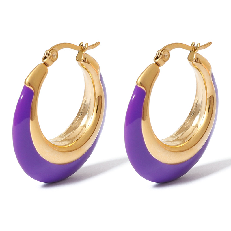 Ces boucles d'oreilles en acier inoxydable présentent un revêtement en émail violet lisse 268C associé à une structure métallique polie. Leur forme créole classique leur confère une allure à la fois tendance et élégante, faisant de ces boucles d'oreilles créoles violettes en acier inoxydable un choix idéal pour les collections de bijoux les plus en vogue.