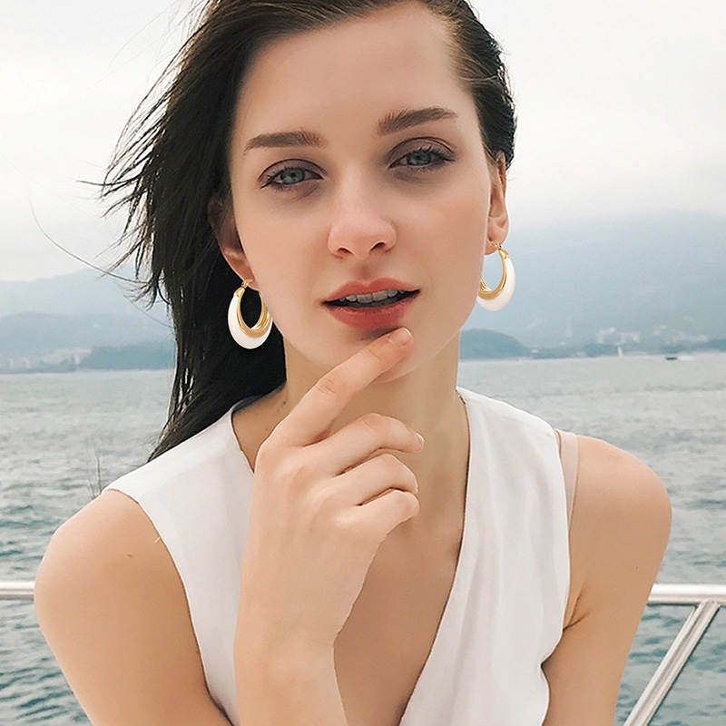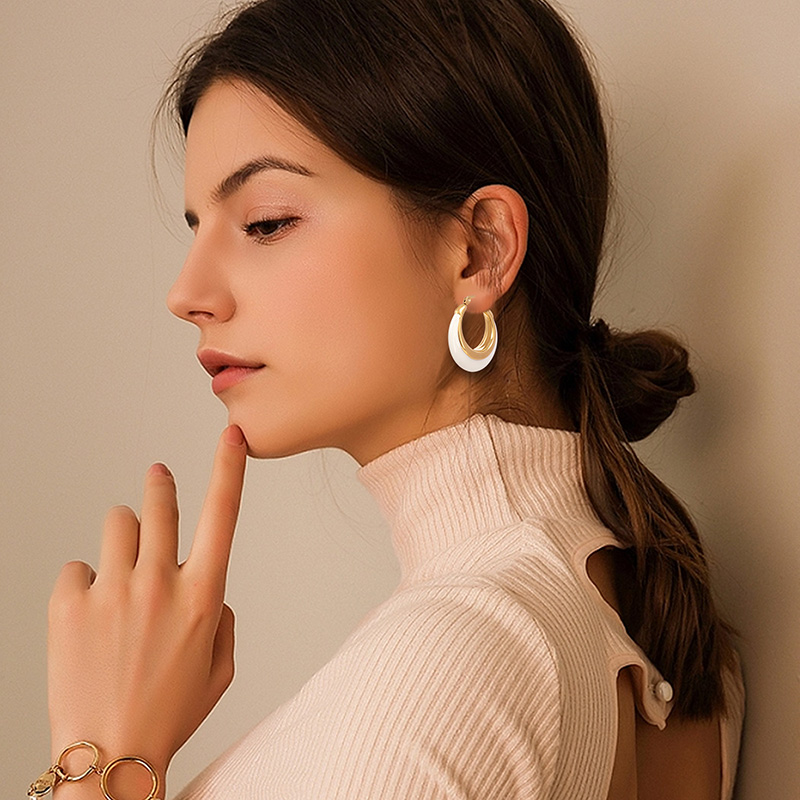 Ces créoles en acier inoxydable présentent une finition en émail blanc lisse combinée à un placage doré poli. Le design élégant de l'anneau ovale crée un style moderne et minimaliste adapté au quotidien et aux collections de mode.