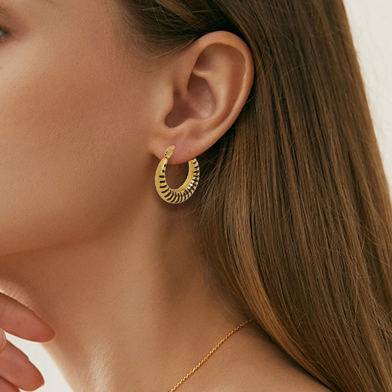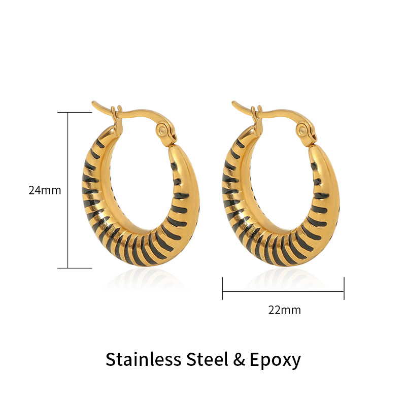 Ces boucles d'oreilles en acier inoxydable arborent une élégante finition dorée rehaussée de détails en émail noir. Leur forme créole audacieuse et leur fermoir sécurisé offrent confort et fiabilité, ce qui en fait des boucles d'oreilles idéales pour les marques et distributeurs de mode.