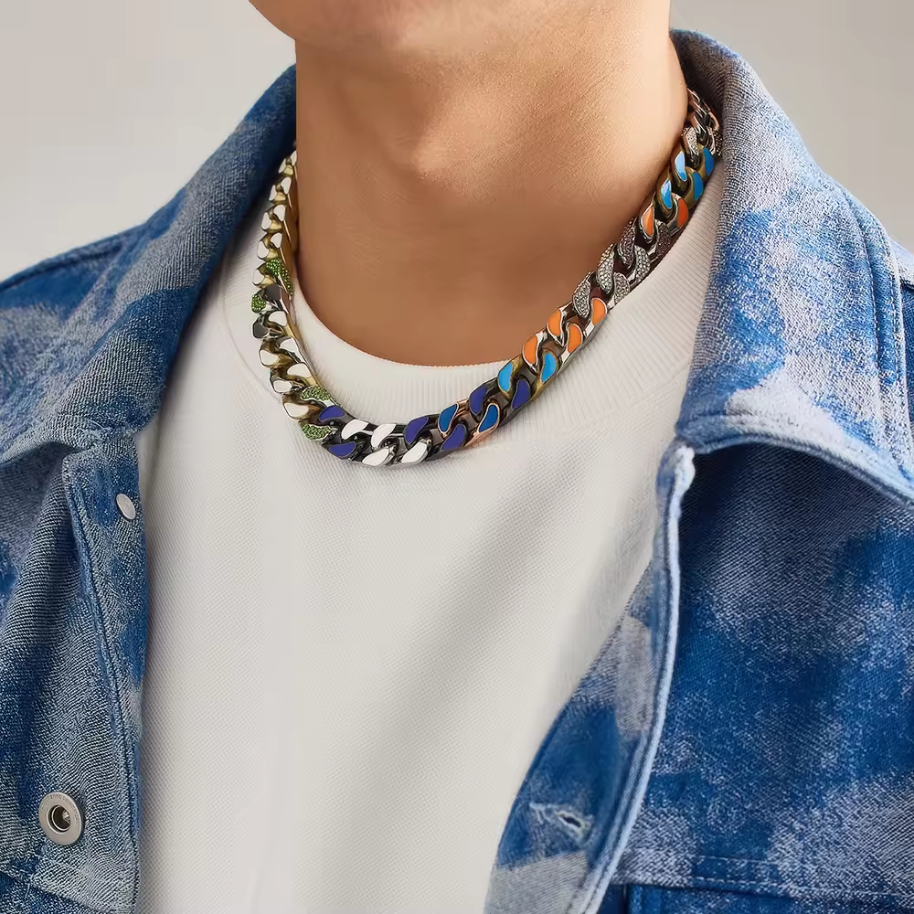 Collier homme en acier inoxydable et zircon, style hip-hop, aux couleurs vives.