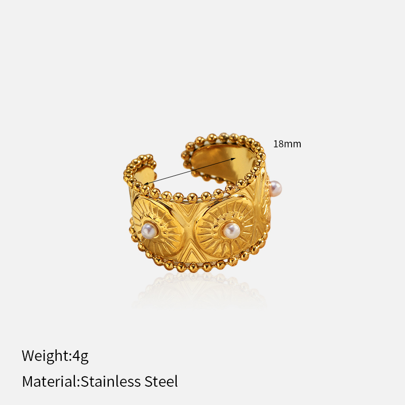 Cette bague en acier inoxydable présente un large anneau doré orné d'élégants détails de perles. Son design reflète un style luxueux et raffiné, idéal pour les femmes qui apprécient à la fois la mode et le confort.