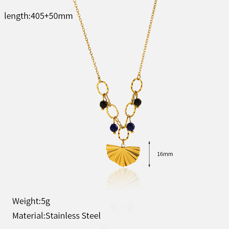 Ce collier pendentif en acier inoxydable est composé d'une chaîne dorée, d'un pendentif raffiné en forme d'éventail et de perles foncées. Conçu pour les femmes, il apporte une touche d'élégance et de style au quotidien.