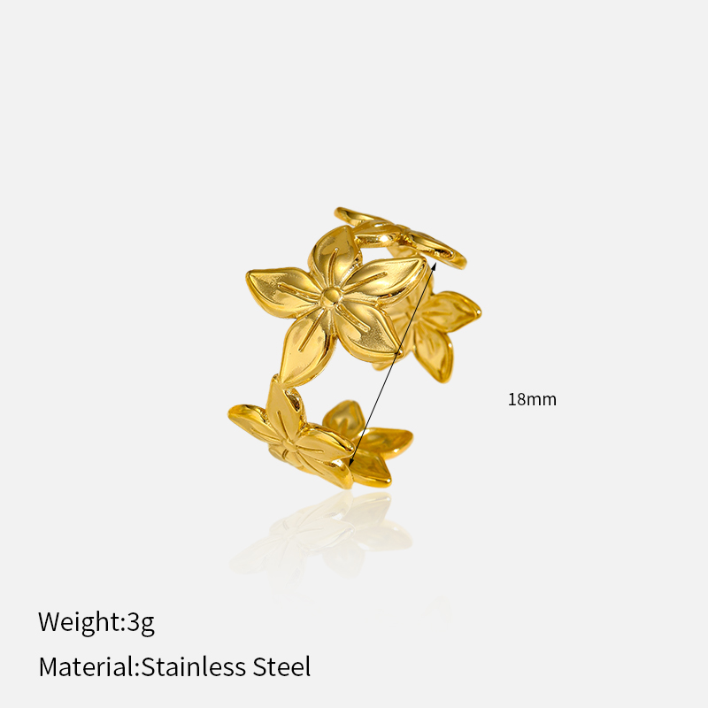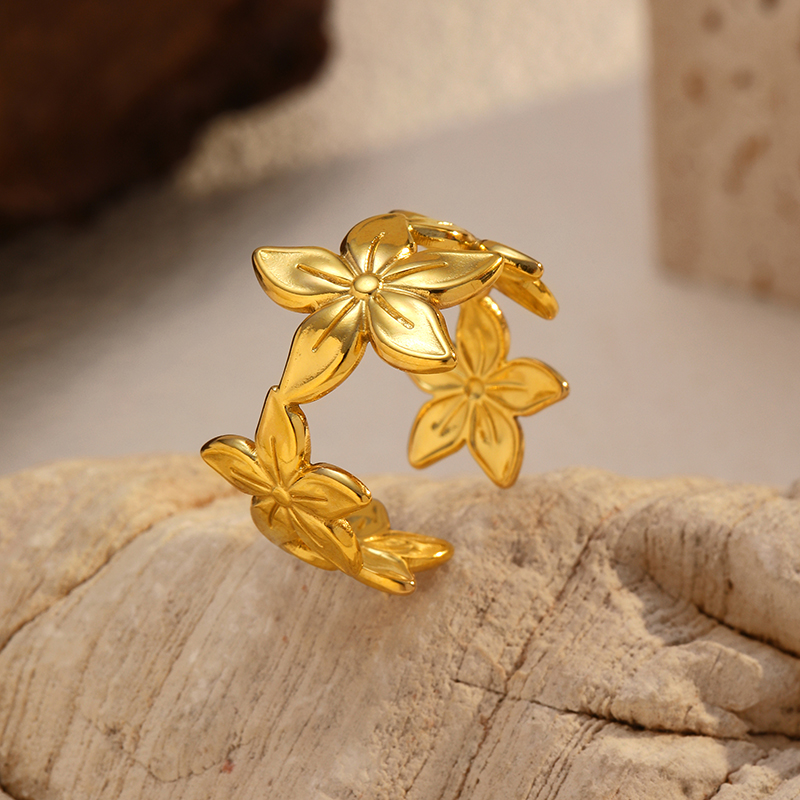 As an adjustable gold stainless steel flower ring for women, it fits different finger sizes easily. The flower detail adds a soft, feminine touch while maintaining a modern and durable stainless steel structure.