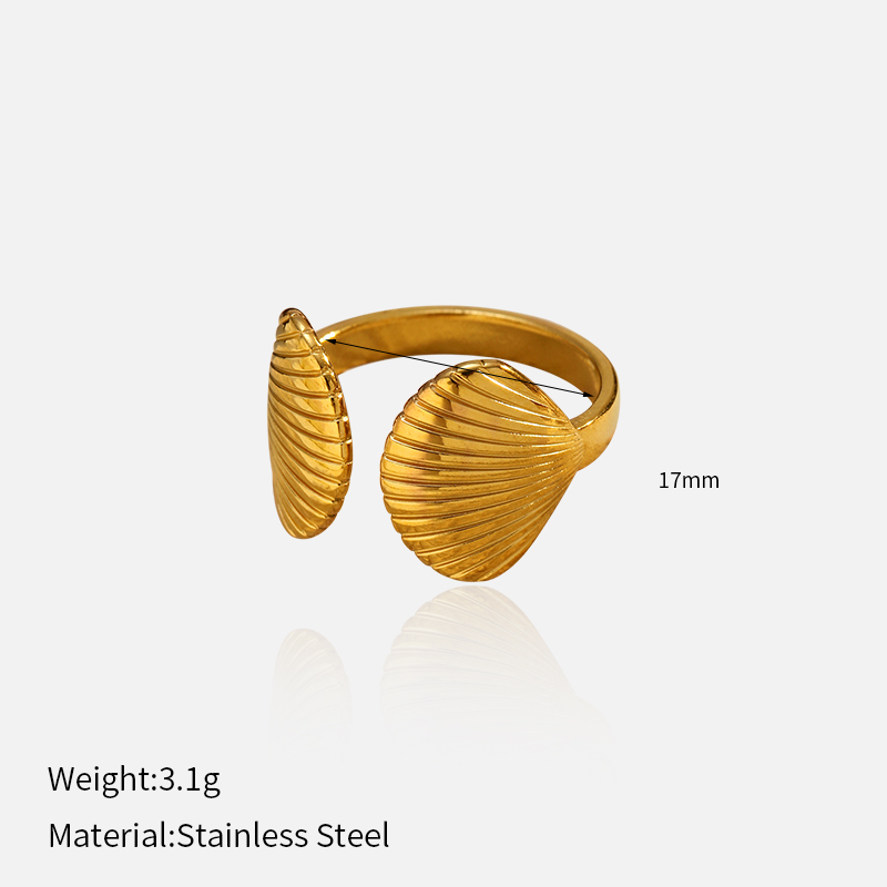 This bold shell stainless steel ring features a sculpted open design with elegant gold plating. The shell shape creates a strong fashion statement while maintaining a refined, modern look suitable for daily wear or styling collections.