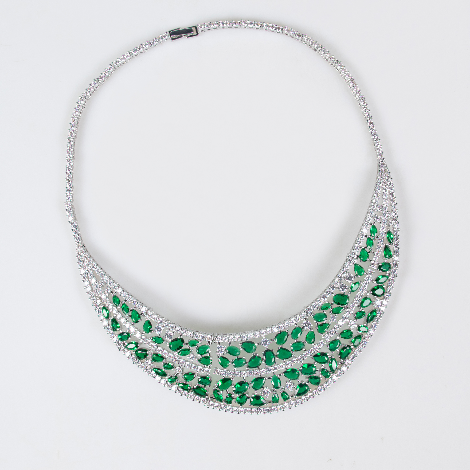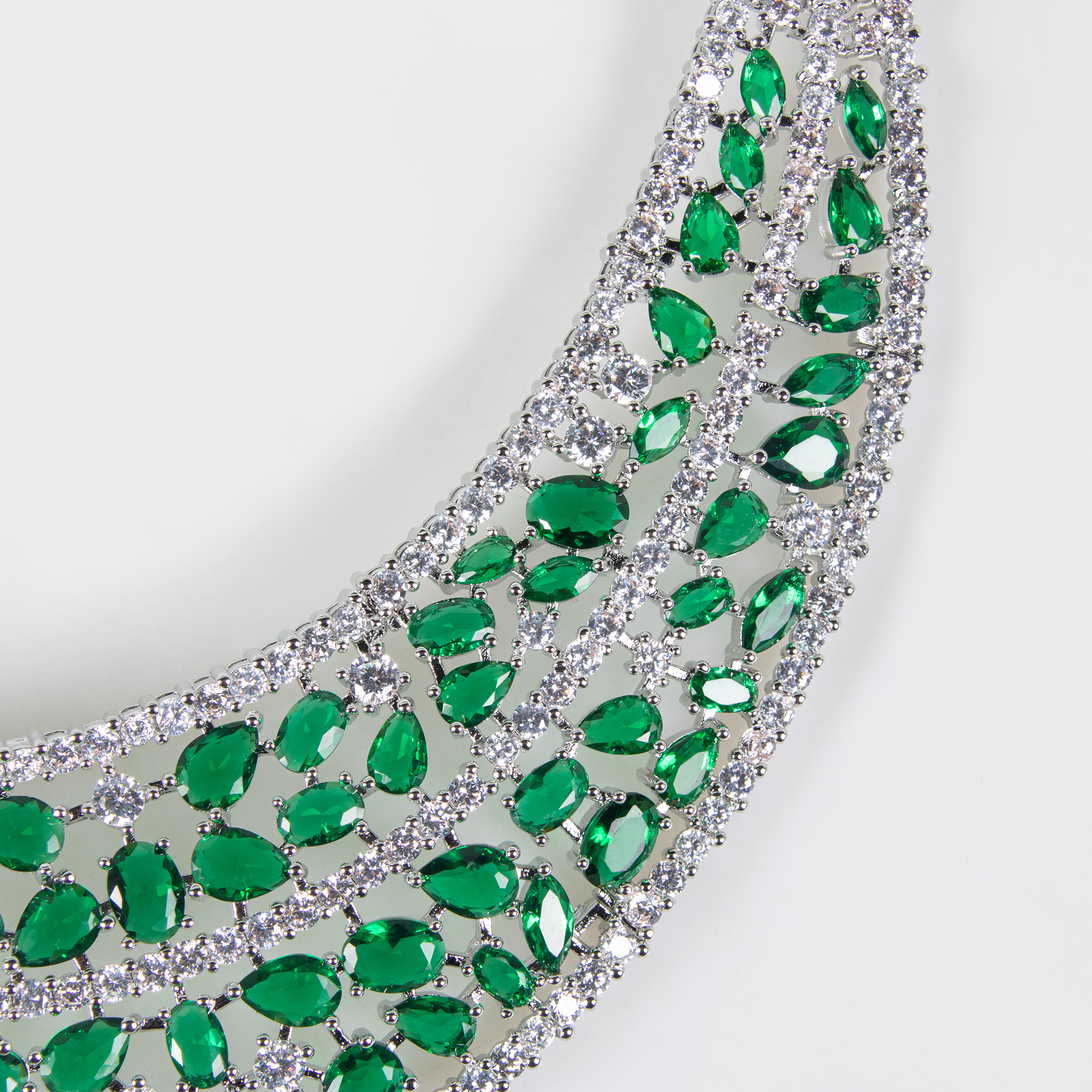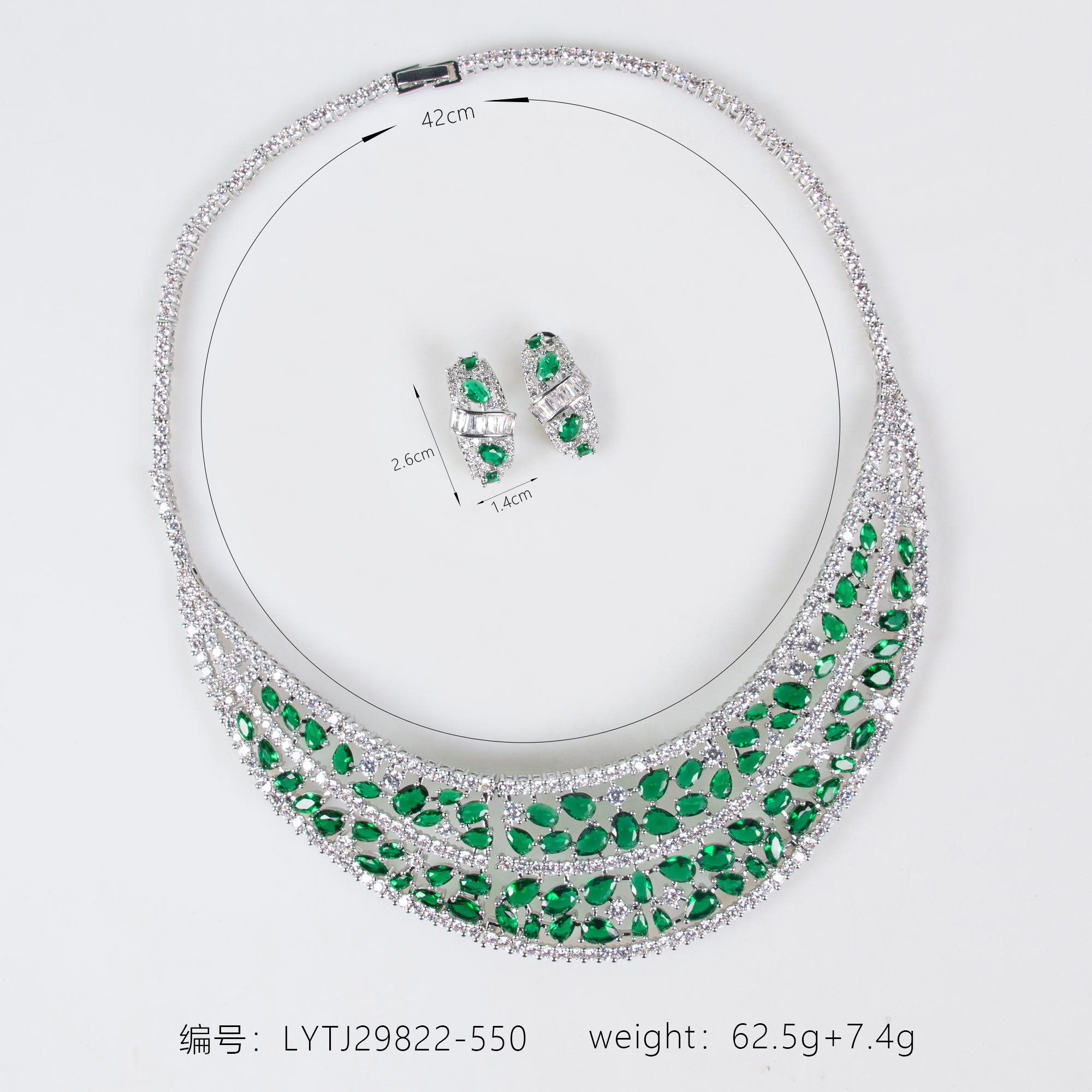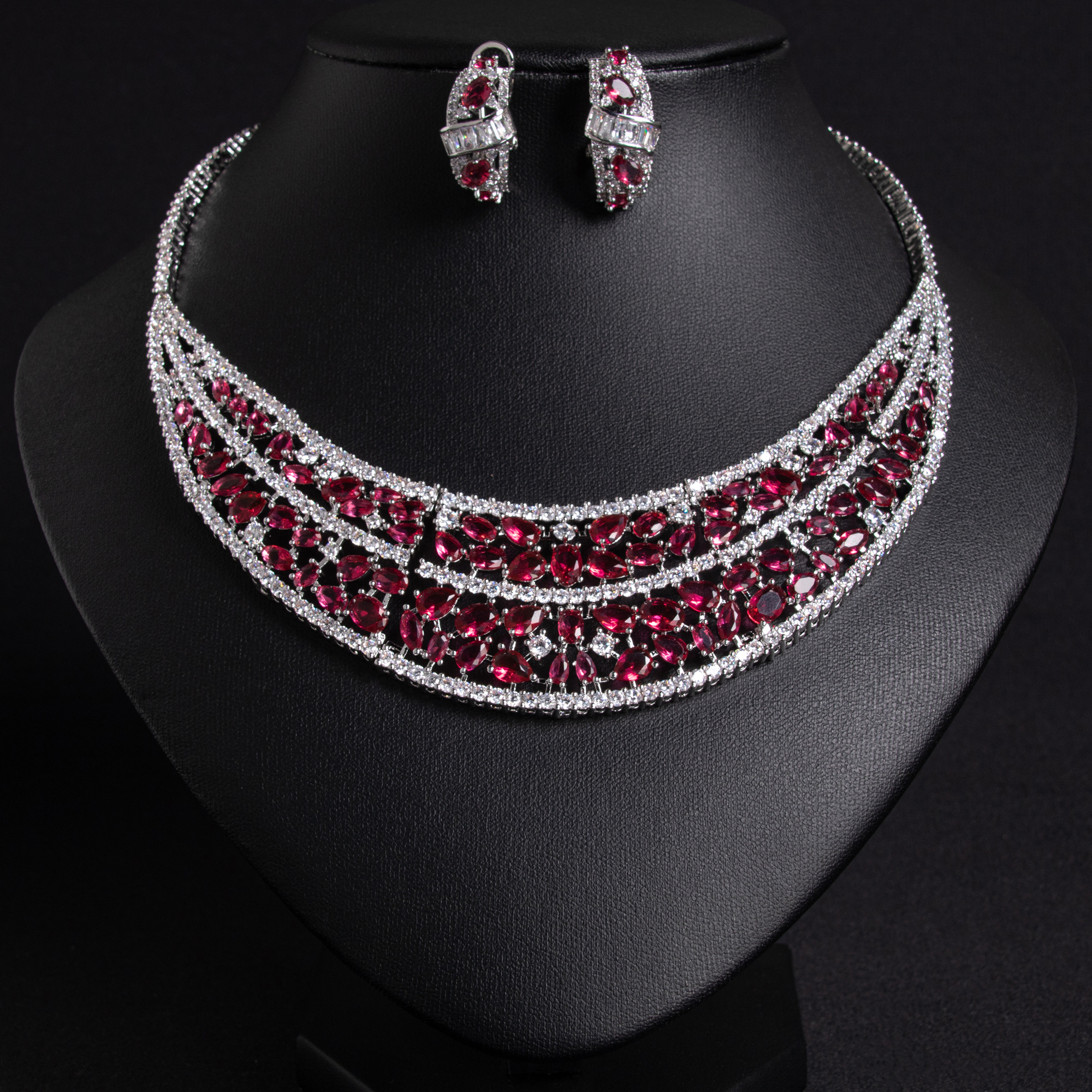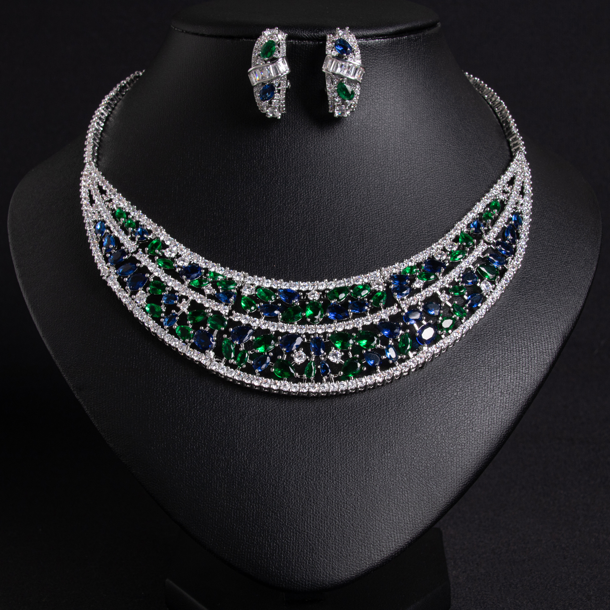 Expertly crafted with hypoallergenic and tarnish resistant plating, this set ensures lasting brilliance. It harmonizes beautifully with the long-tail styles such as the 18k gold plated brass green-blue/red garnet multi layer collar necklace & earring set (wedding accessory).