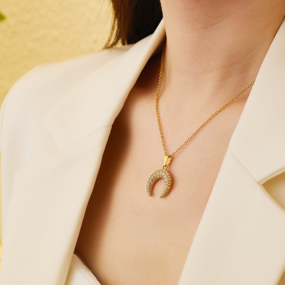 Crafted from high-grade stainless steel with a thick, uniform 18k gold-plated coating and embedded with top-tier transparent crystals, this women's necklace boasts exceptional durability, tarnish resistance and long-lasting glossy texture. The 18k gold-plated layer retains its warm metallic luster without peeling or fading, and the stainless steel base ensures structural sturdiness and scratch resistance for daily wear. The selected crystals are of high clarity and good light refraction, and they are firmly inlaid in the moon pendant via professional setting technology to prevent falling off, providing a comfortable and reliable wearing experience.