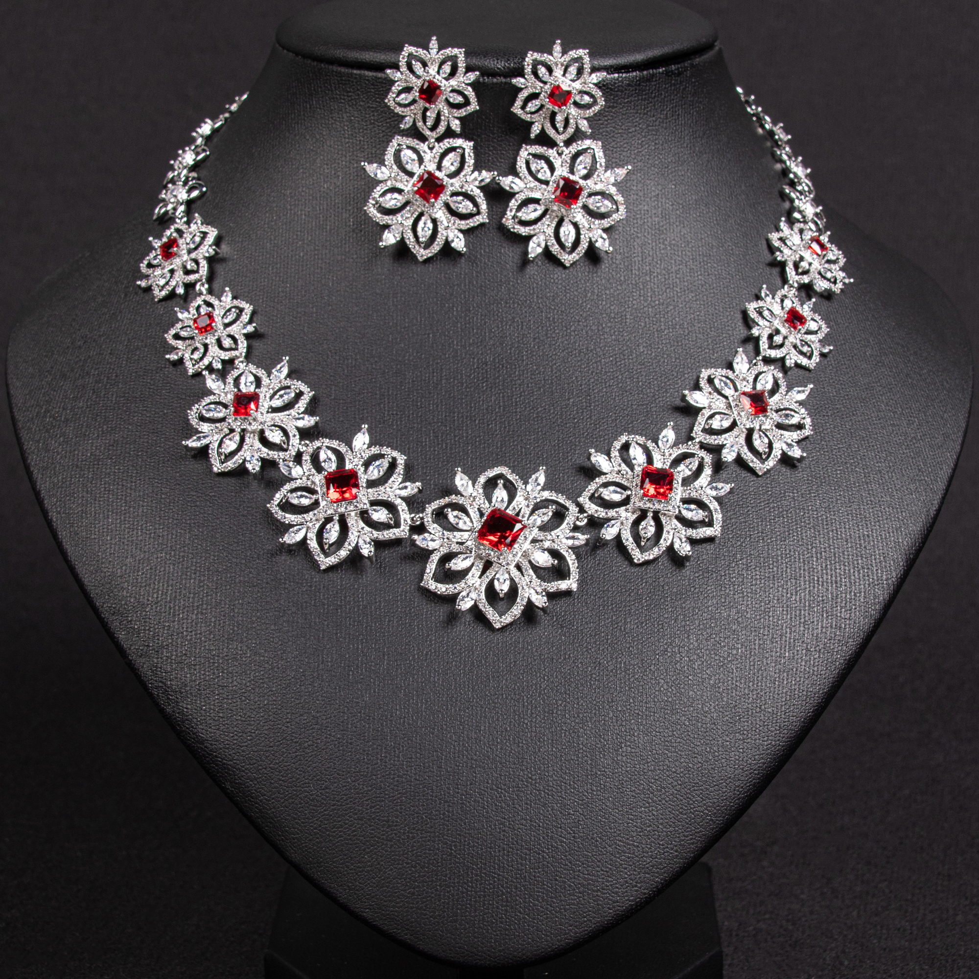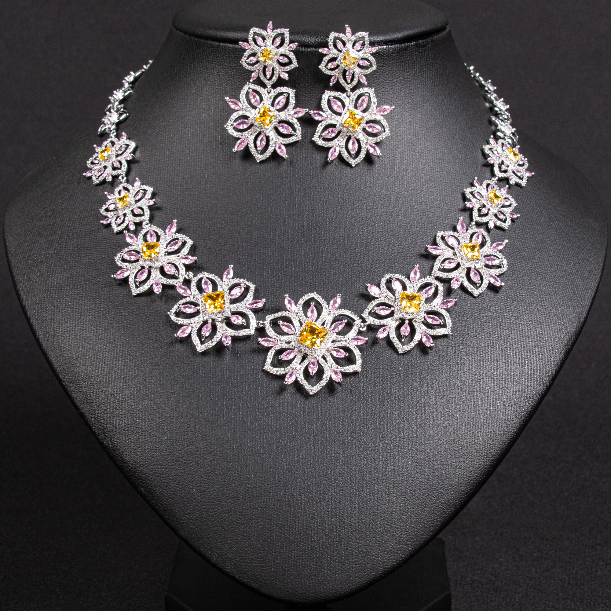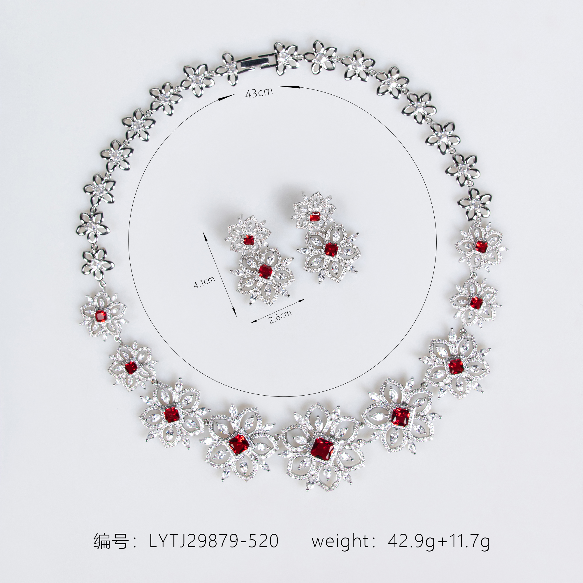 This women’s 18k gold plated brass floral gem collar jewelry set features shimmering pink-yellow or red garnet stones, perfect for everyday elegant occasion styling. Its floral arrangement is crafted to be lightweight, durable, and visually striking.