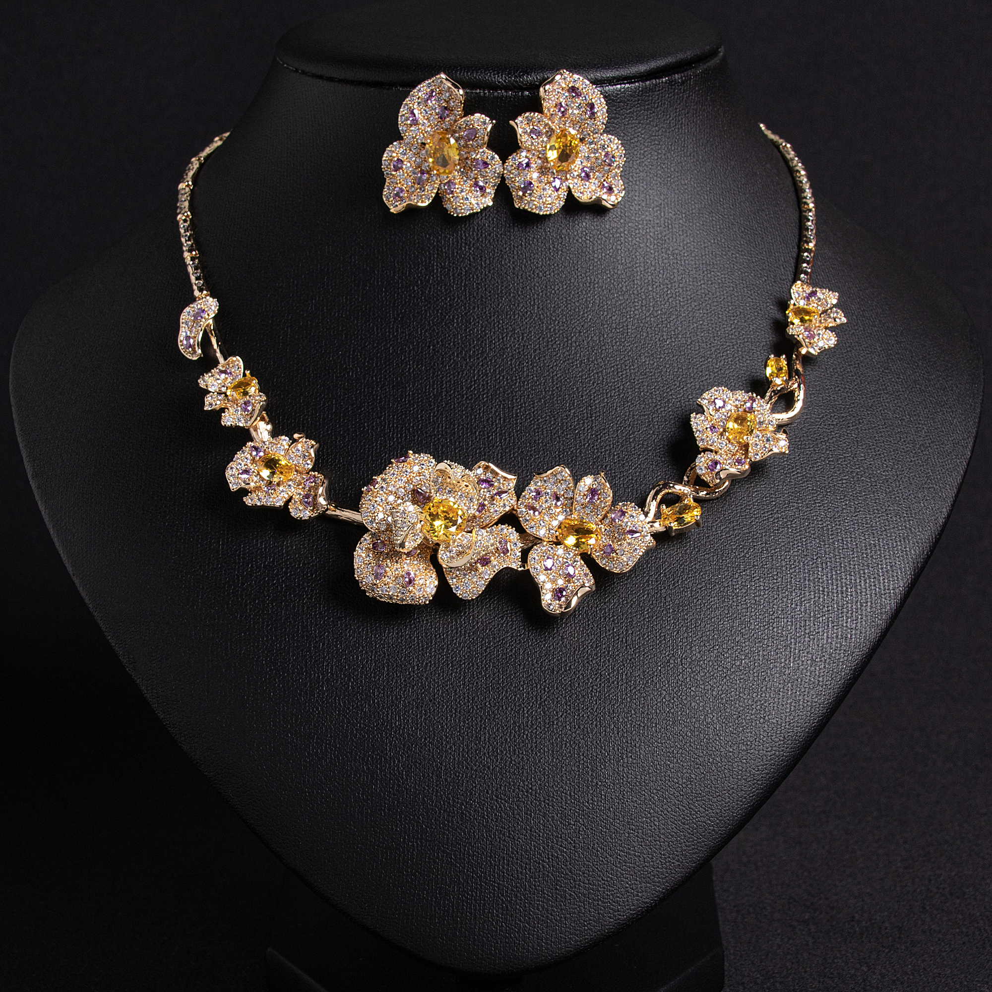 As an exceptional choice among bridal jewelry sets, this necklace and earring set enhances any wedding accessory collection. The 18k gold plated brass emerald/yellow-purple floral necklace & earring set (wedding accessory) pairs flawlessly with bridal gowns and elegant evening wear.