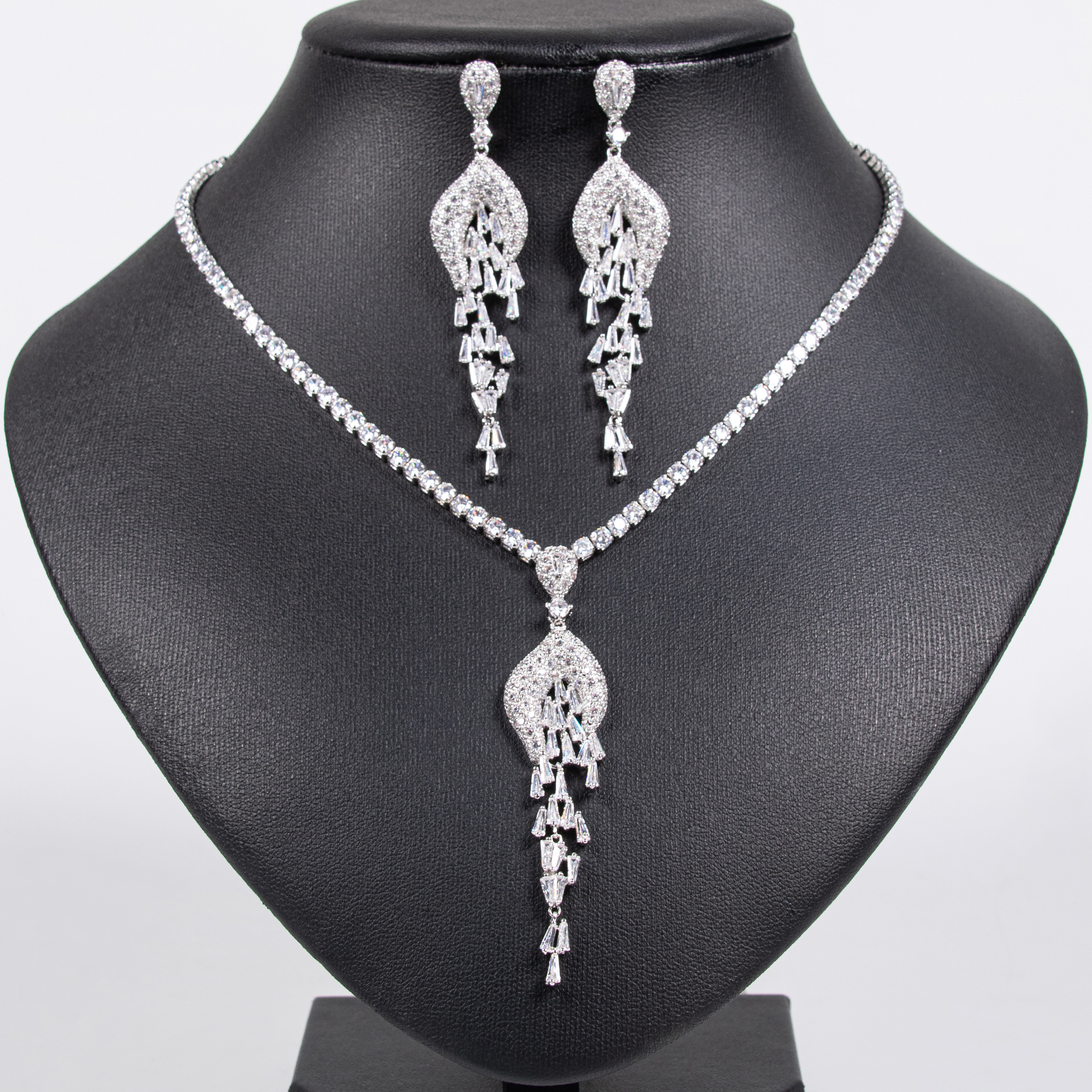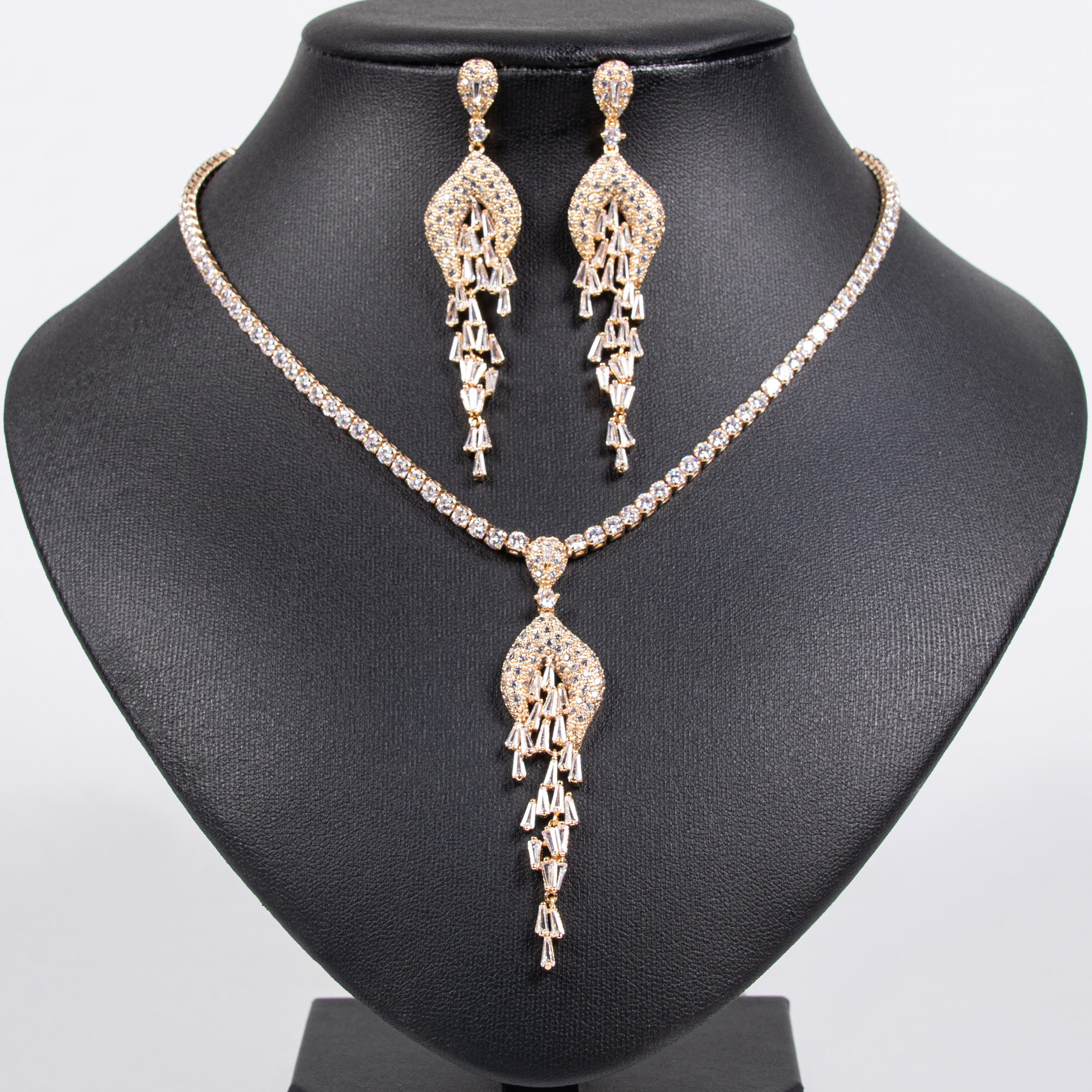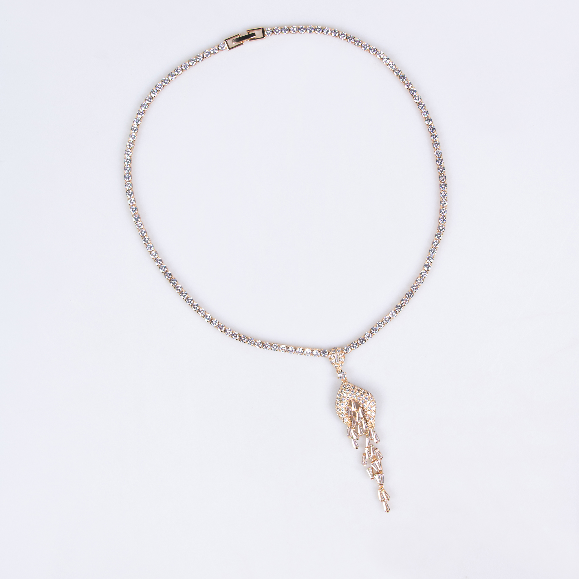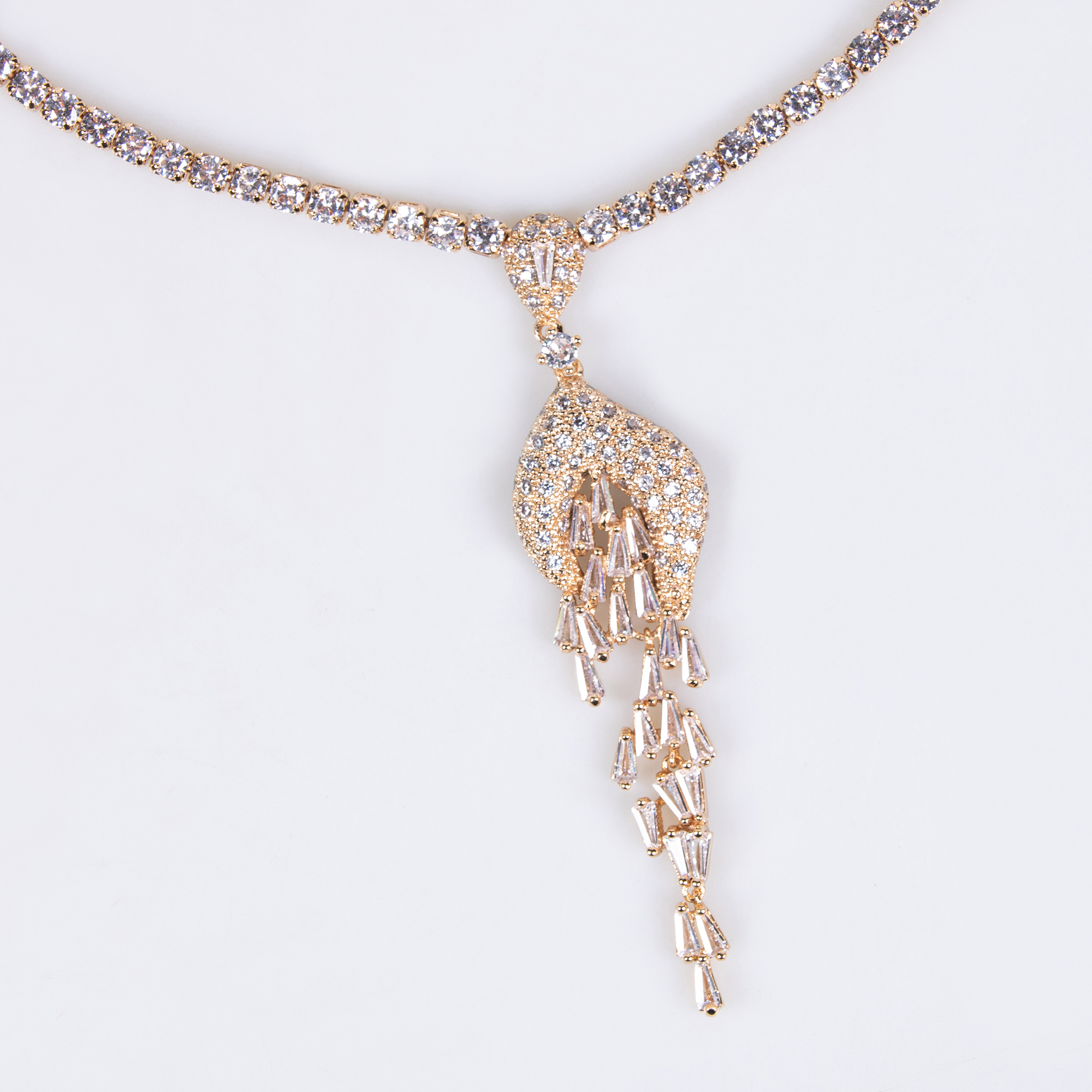 Lonceen presents an elegant 18k gold plated brass pavé-set tassel dangle necklace set crafted to elevate wedding jewelry sets for brides.