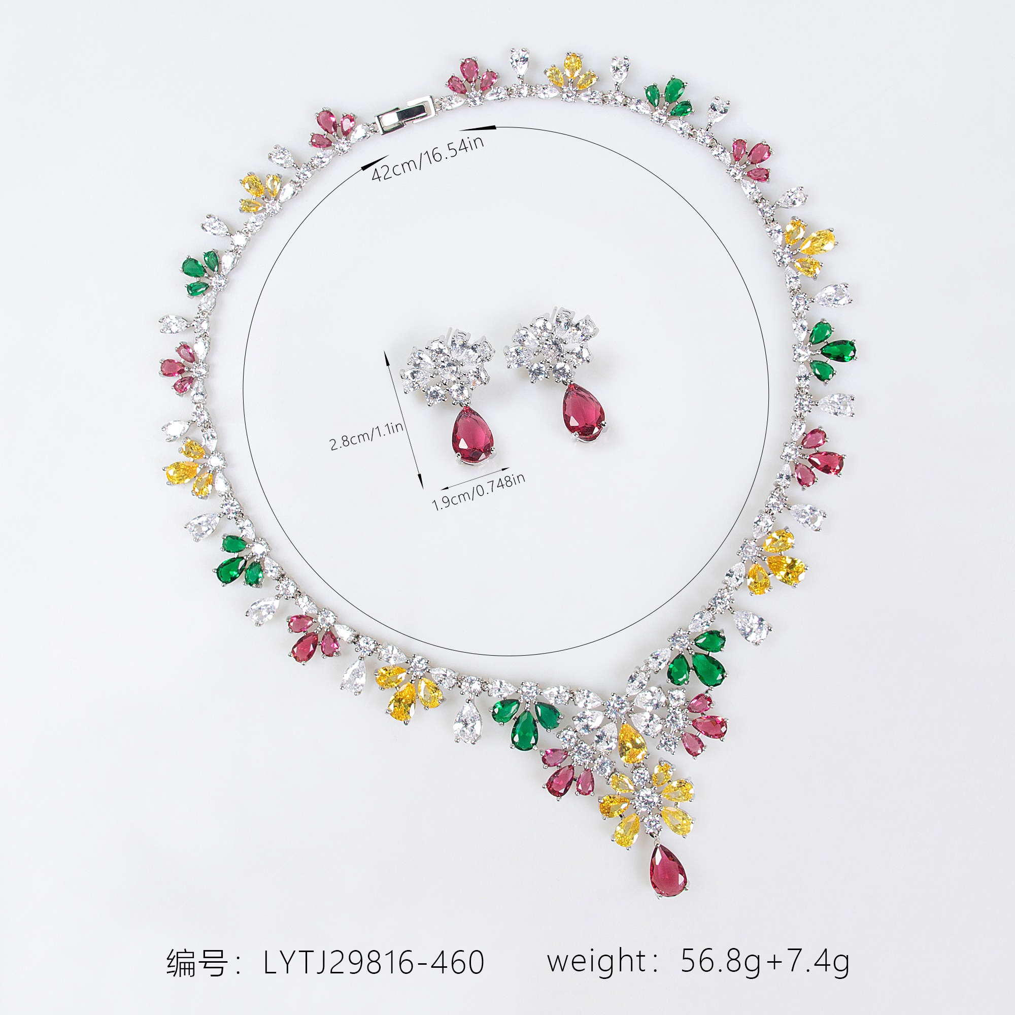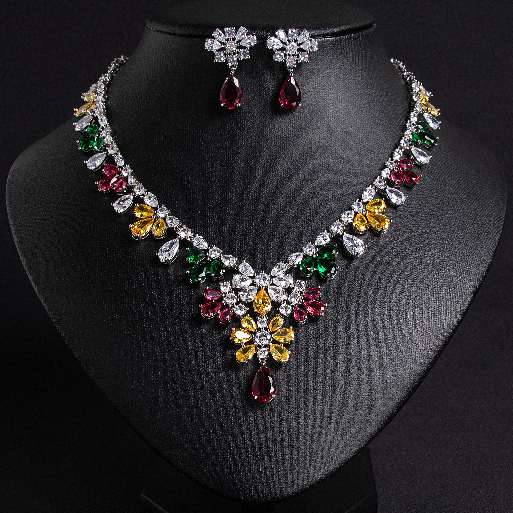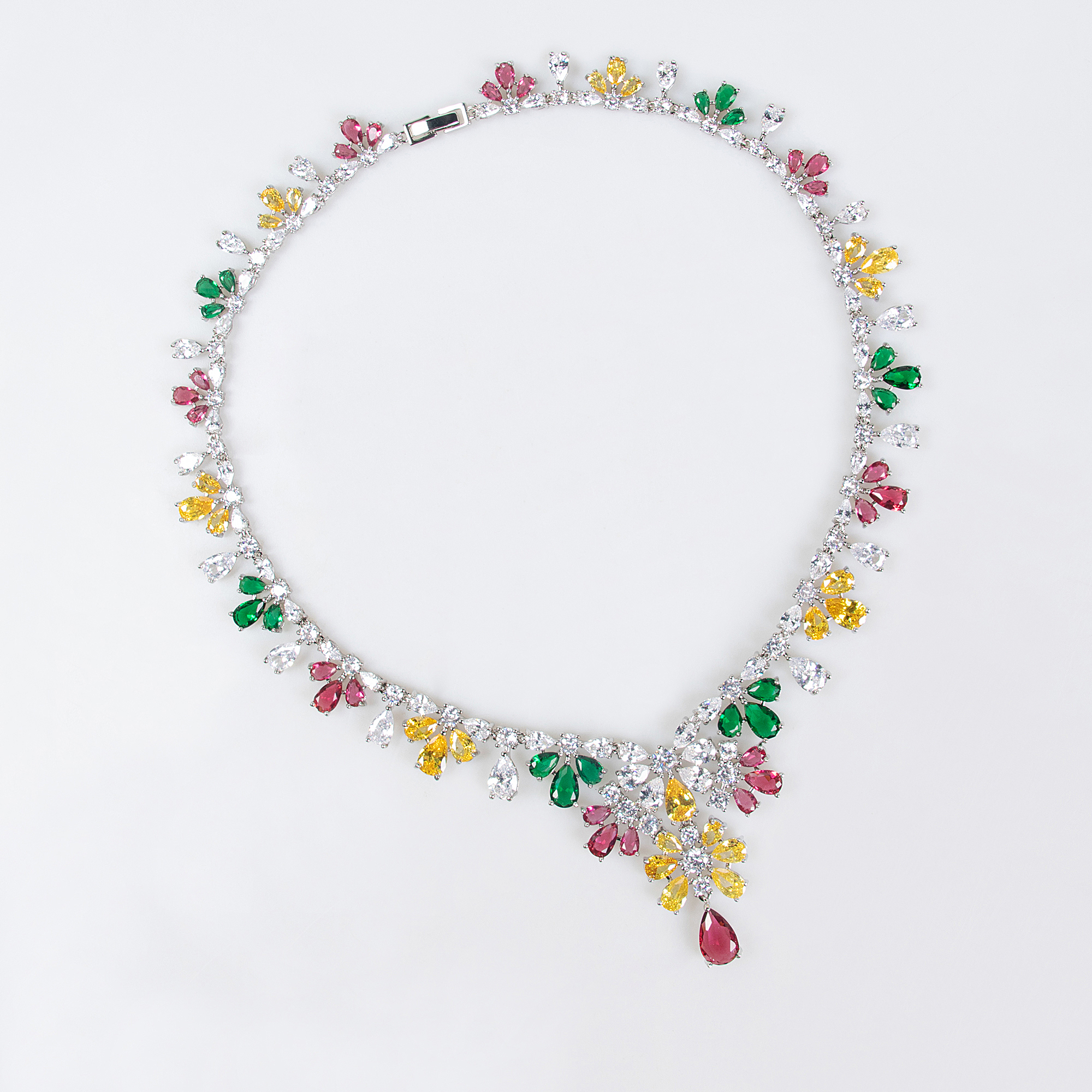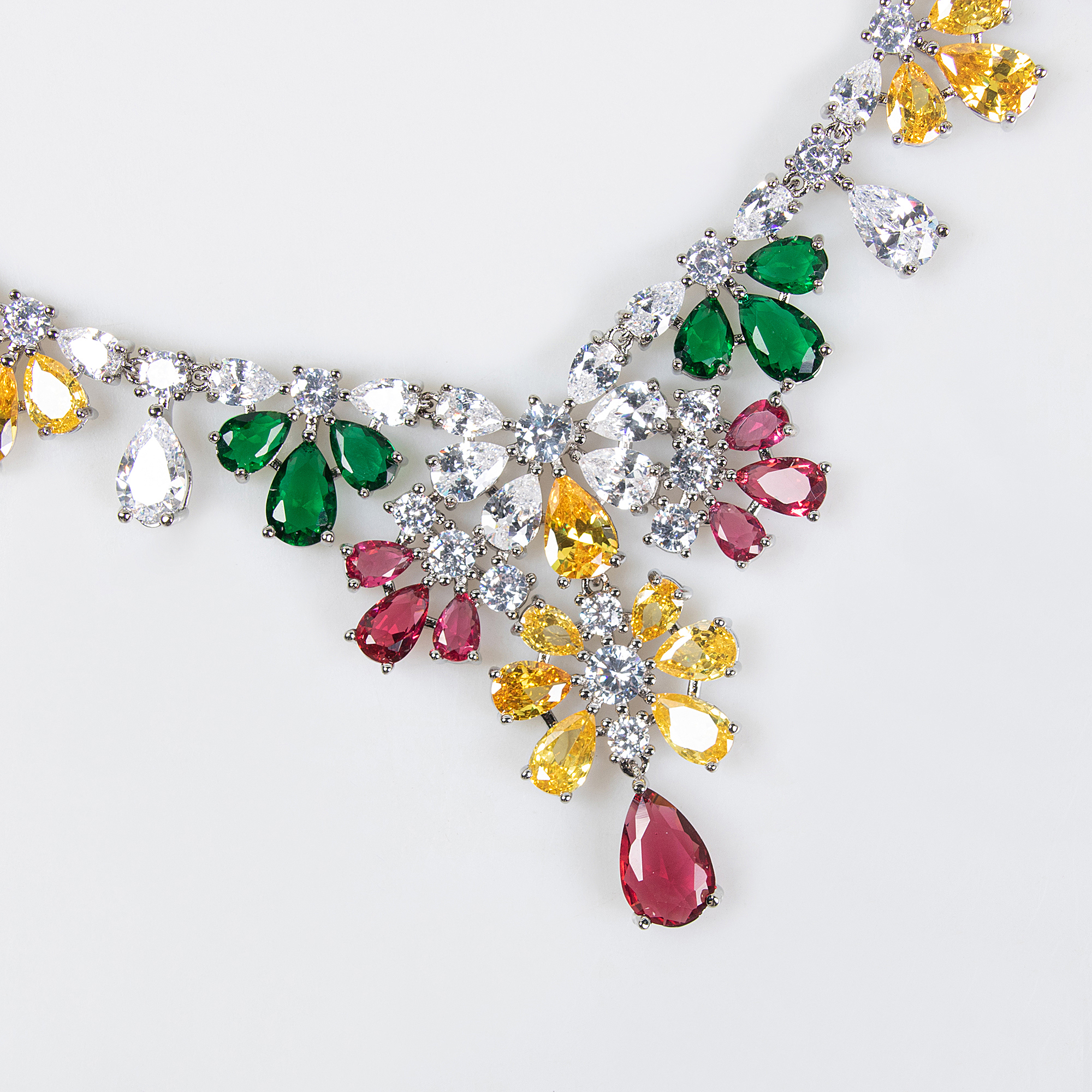 Made from premium 18k gold plated brass, our jewelry sets ensure a hypoallergenic, tarnish resistant experience. This elegant 18k gold plated brass floral teardrop gem collar set is crafted for lasting brilliance, ideal for weddings and formal occasions.