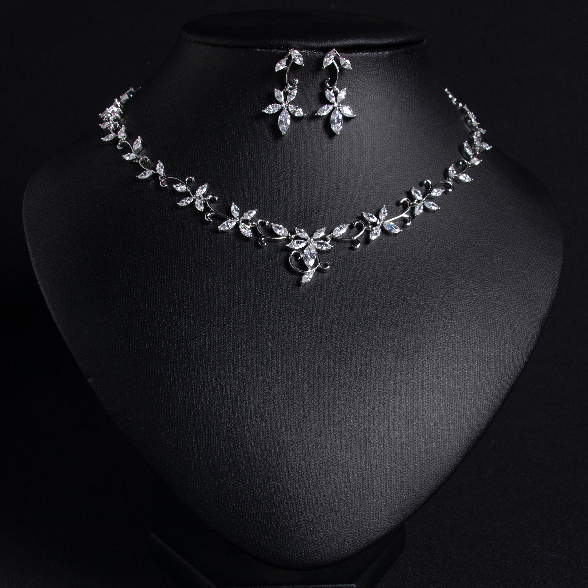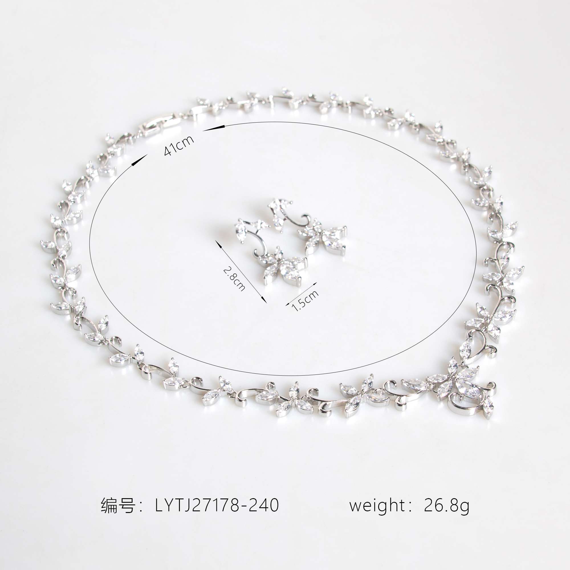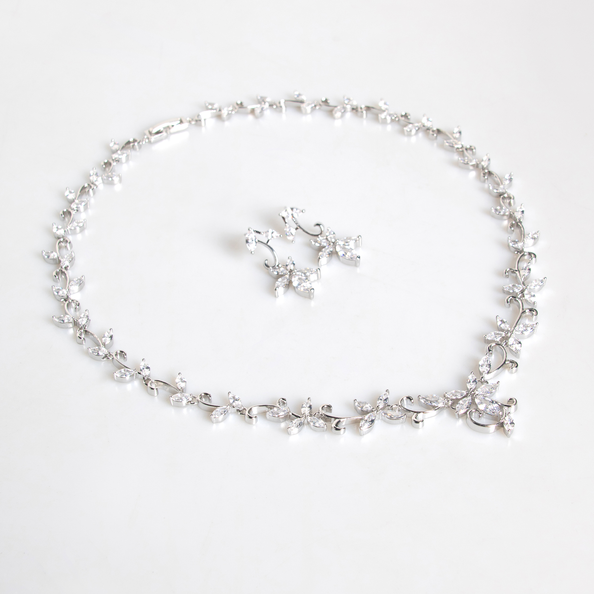 Designed with precision, the Women’s 18k gold plated brass silver-tone floral vine crystal collar jewelry set offers both elegance and durability. The flowing vine silhouette and clear crystals enhance the natural beauty of the bride.
