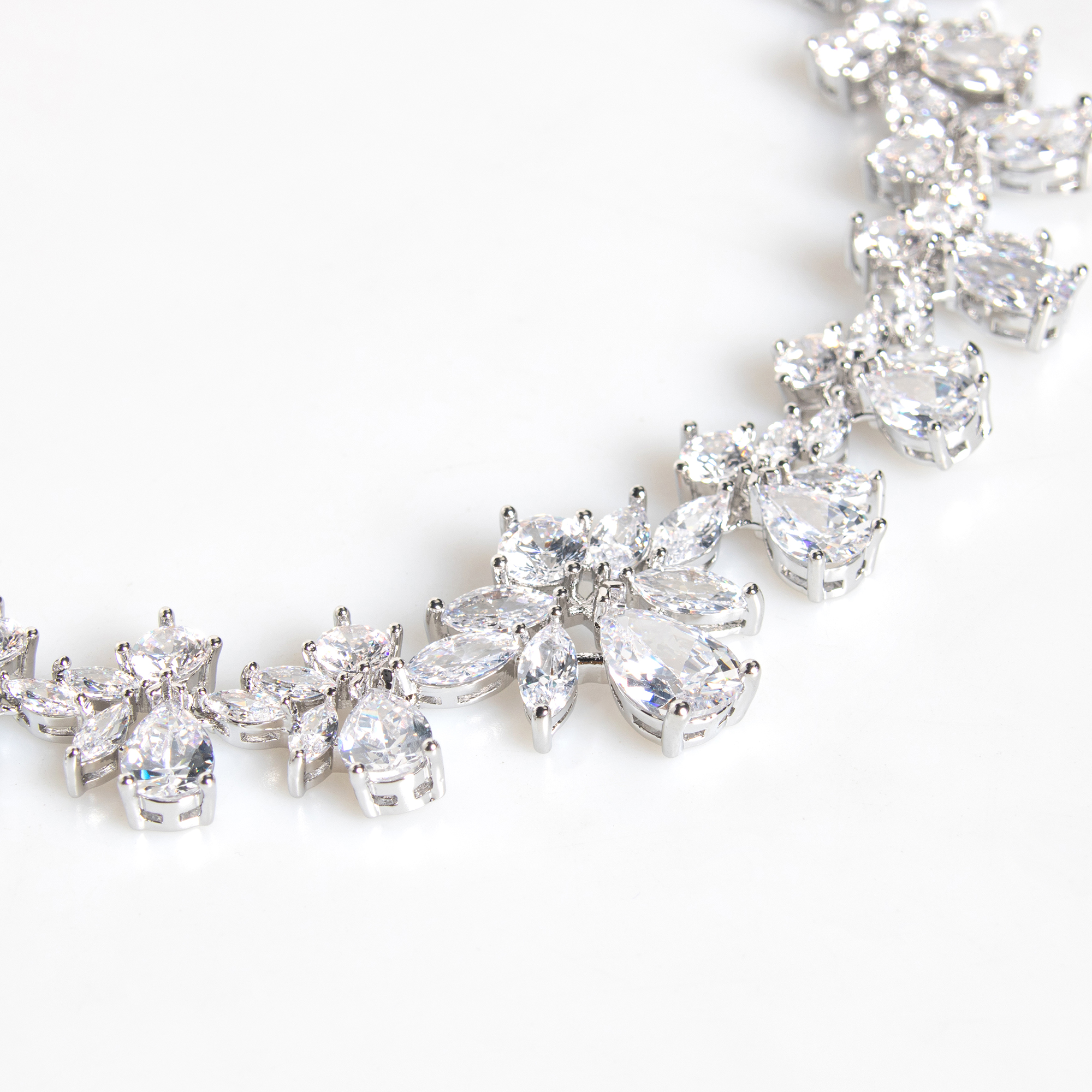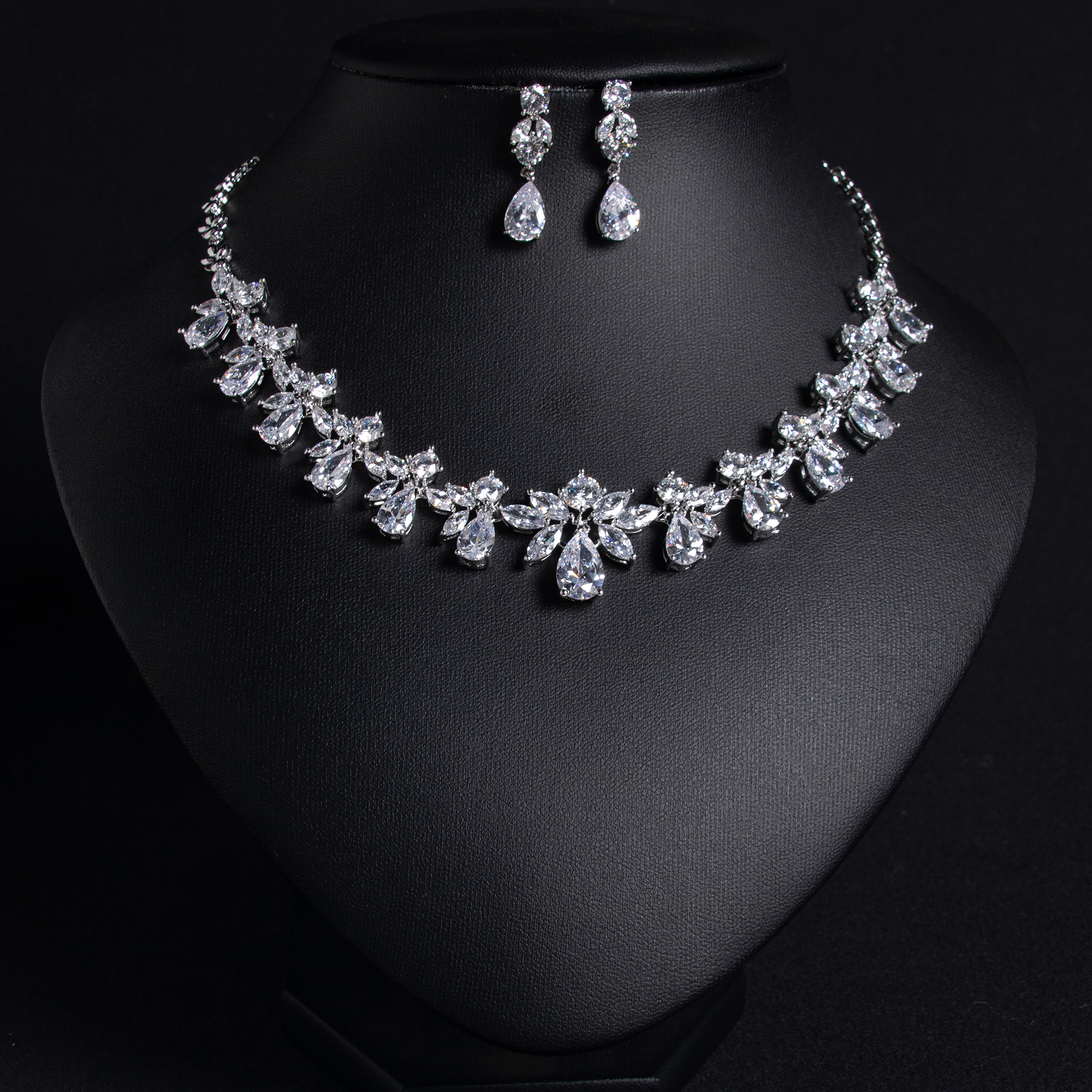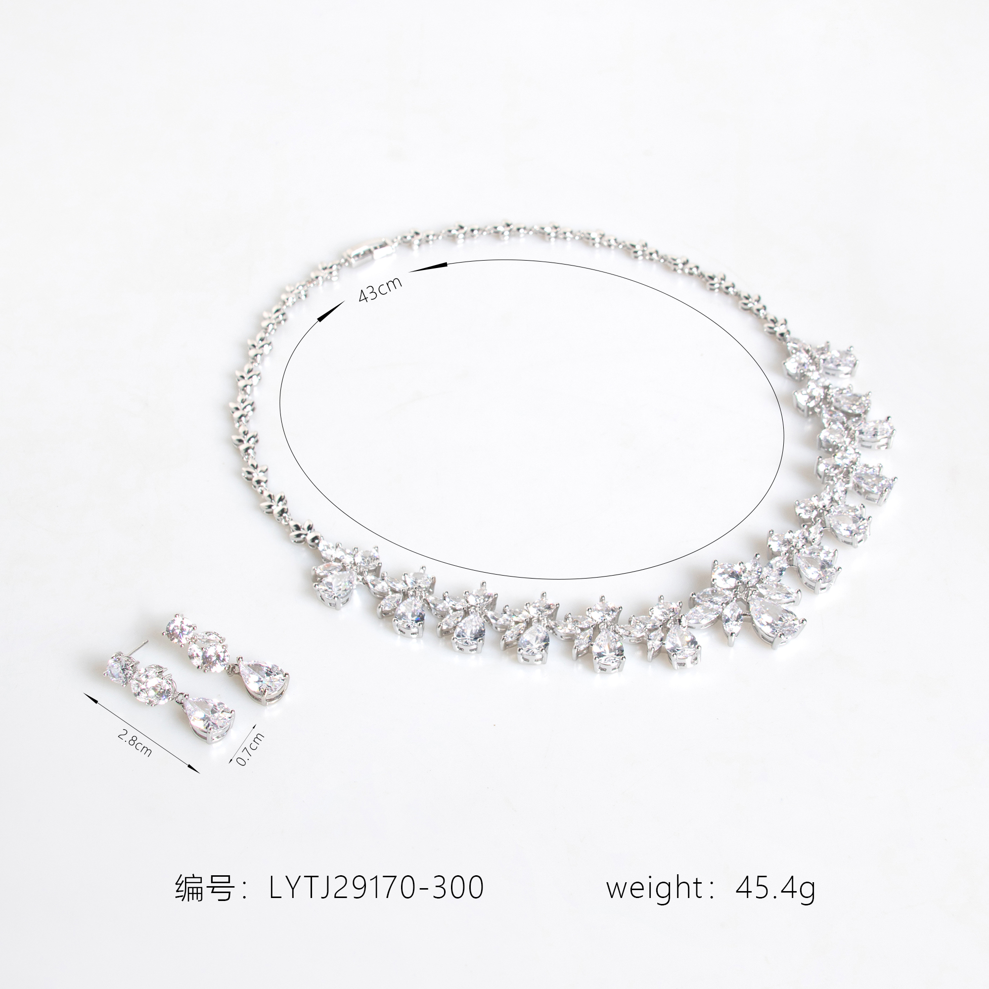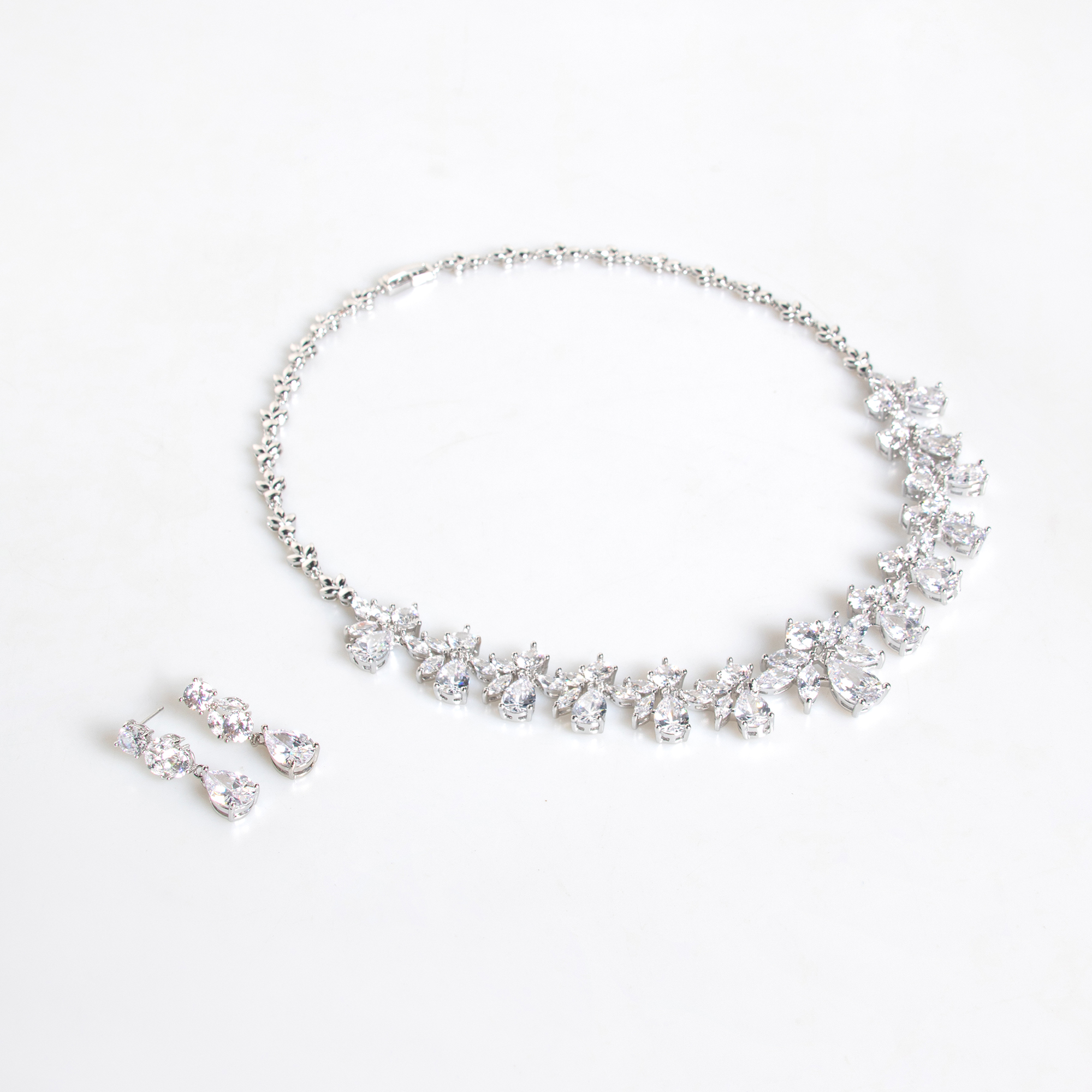 As a standout bridal jewelry set, it pairs perfectly with gowns and accessories. The 18k gold plated brass teardrop floral crystal collar necklace & earring set serves as an ideal wedding accessory that enhances beauty and grace.