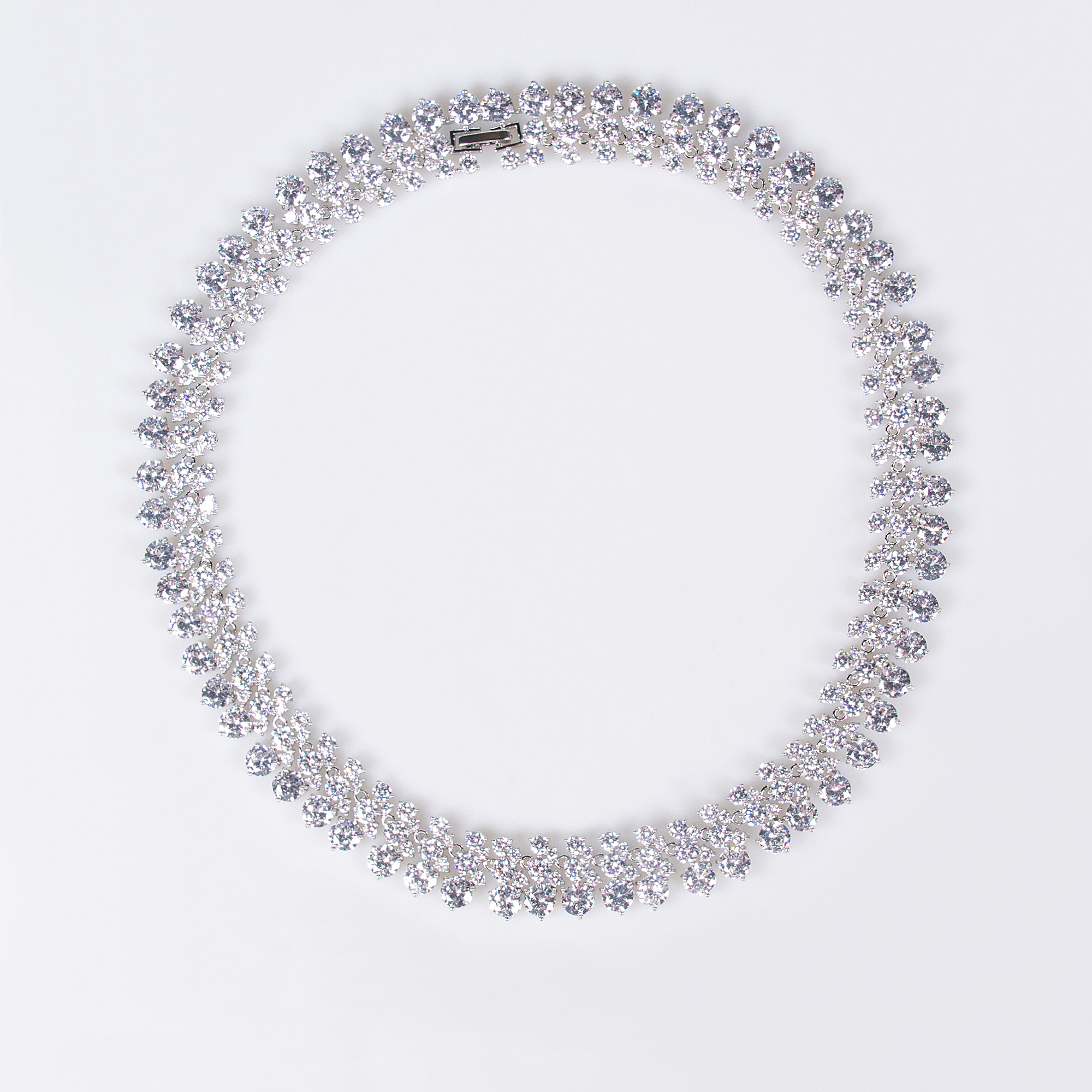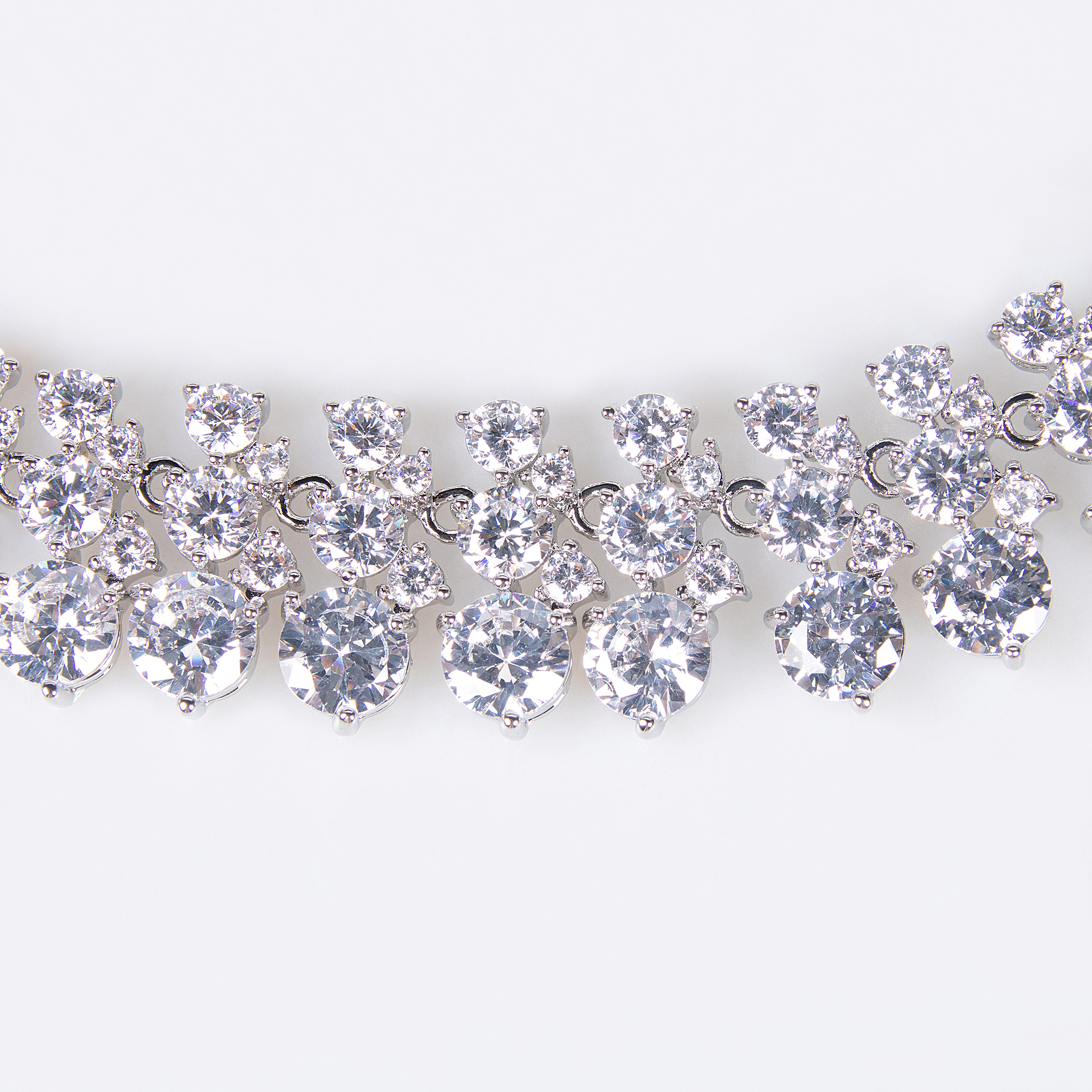 This 18k gold plated brass silver-tone wide pavé crystal geometric cluster collar necklace & earring set showcases brilliant craftsmanship. The geometric pavé crystals create a bold yet refined shine, making it ideal for wedding jewelry sets for brides and elegant formal wear.
