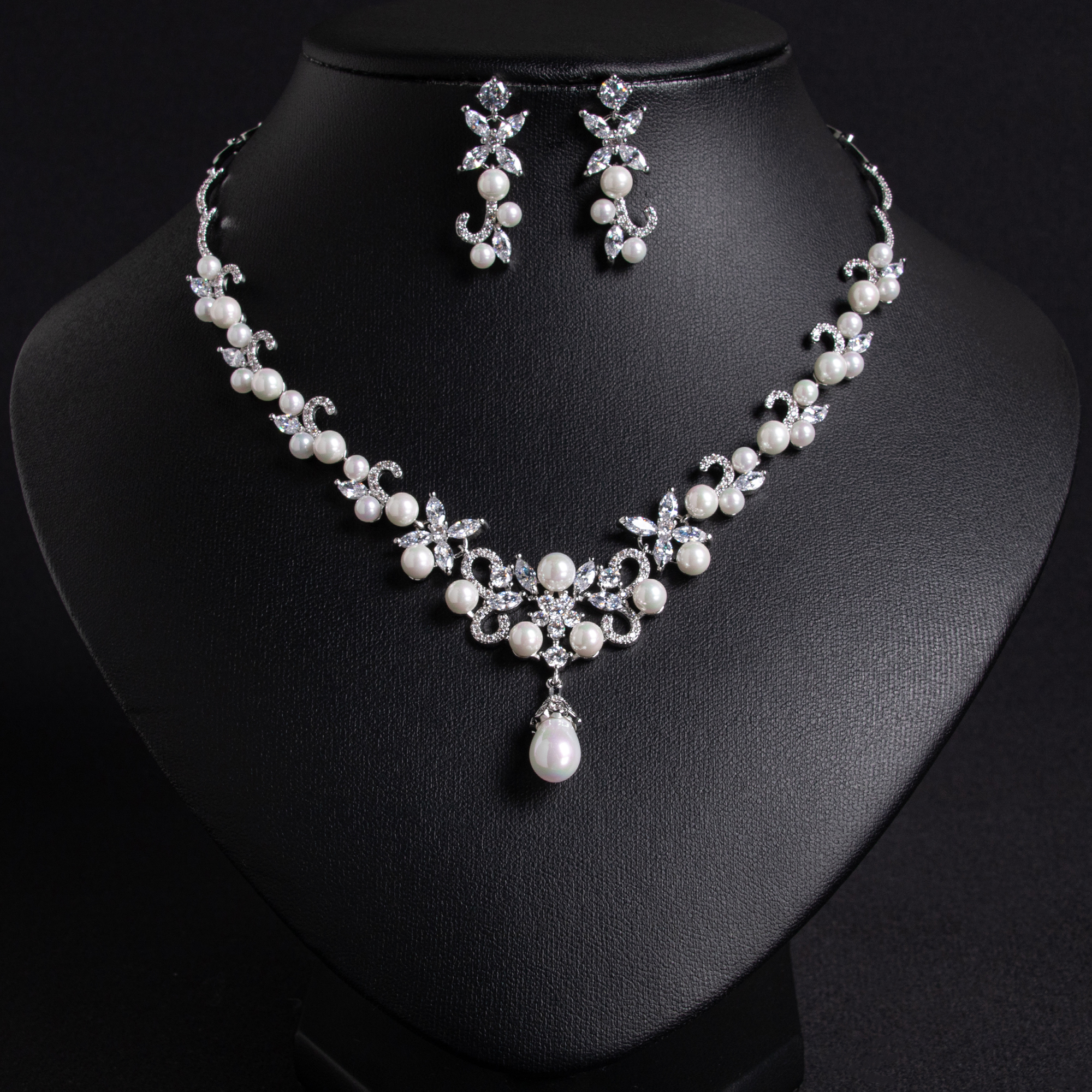 This elegant pearl 2-piece set transitions seamlessly from daytime elegance to evening sophistication. The floral design pearl jewelry features carefully selected freshwater pearls and precision-set zircon stones, offering versatility for various occasions.