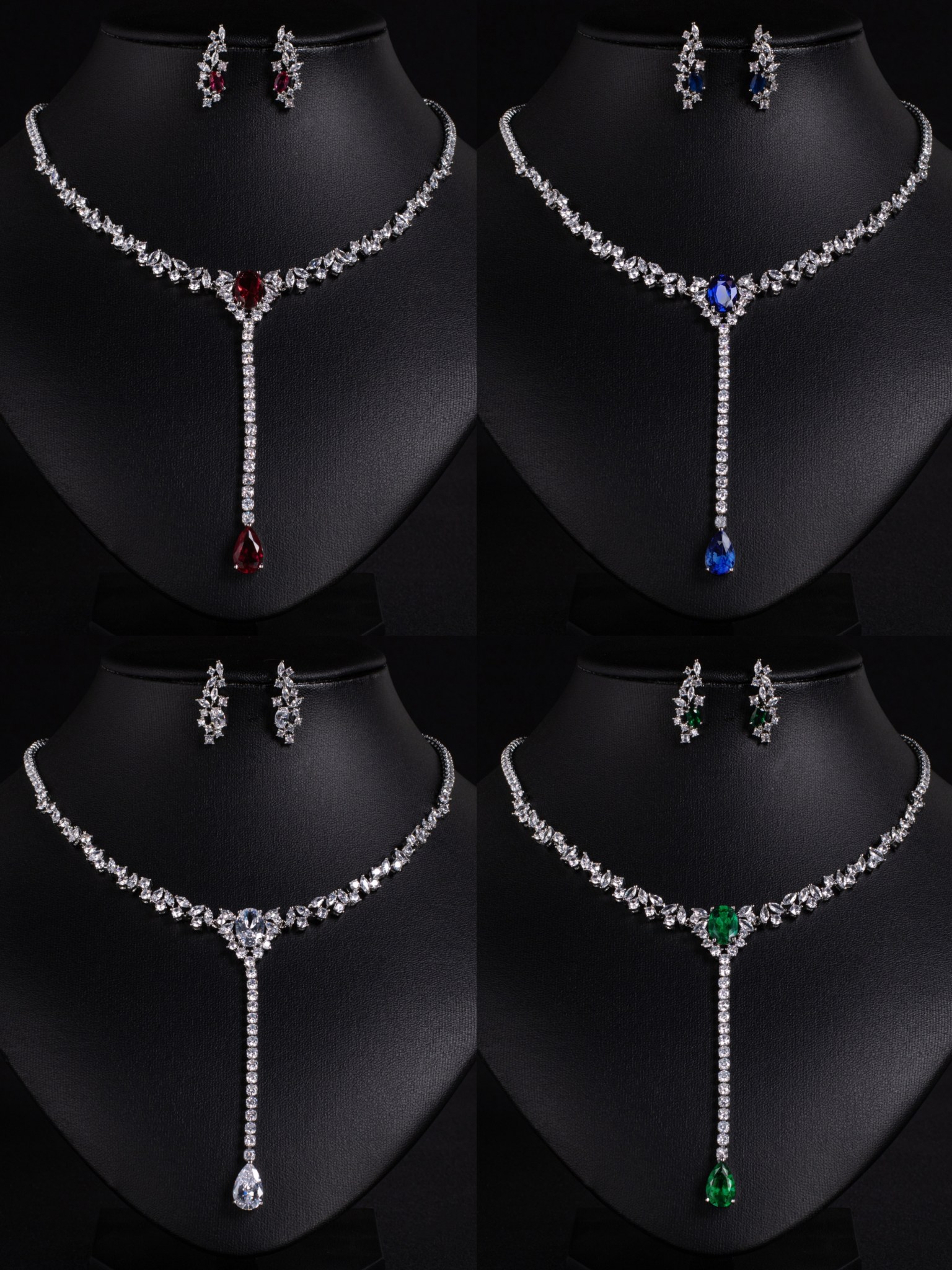 This copper plated 18k gold tassel teardrop zircon jewelry set features multicolor zircon stones in red blue white and green creating a light luxury vintage glamorous style.
