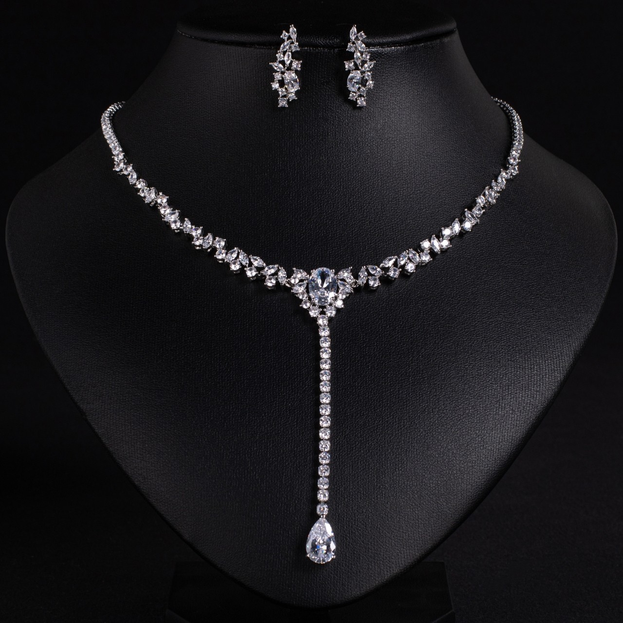 The tarnish resistant 18k gold plated brass clear teardrop Y drop cubic zirconia necklace set is ideal for bridal ceremonies banquets and everyday elegant wear.