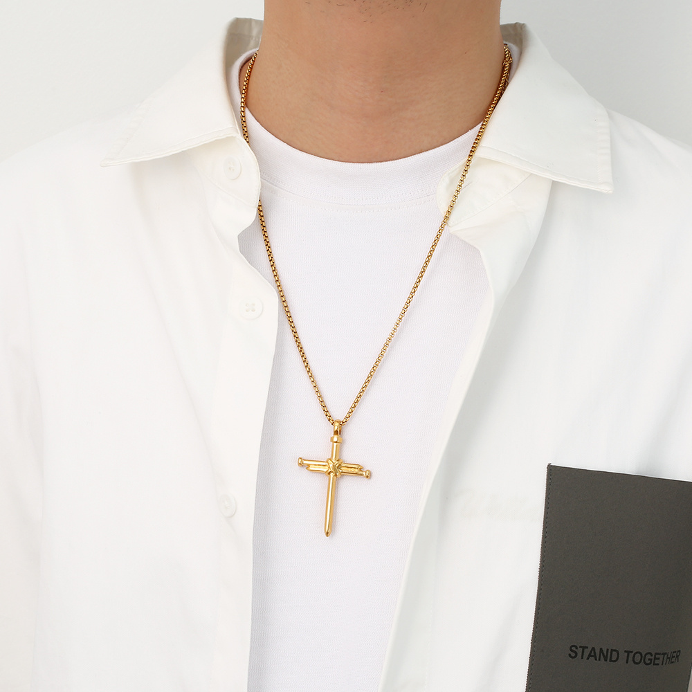 This Lonceen men necklace features a dual-tone (gold/silver) nail cross pendant—blending religious symbolism and rugged modern style, tailored for men’s faith-centered wear.