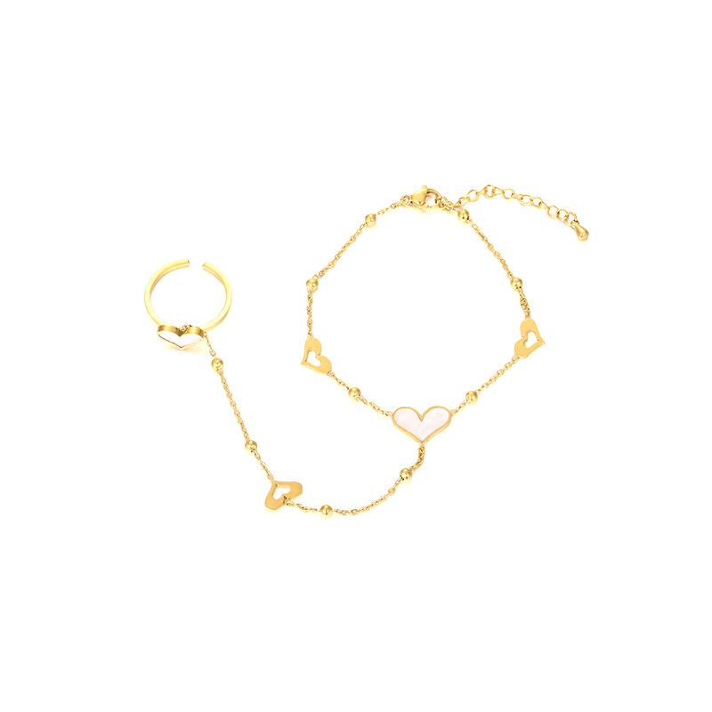 This heart stainless steel bracelet features a gold stainless steel bracelet chain connected to a delicate ring, forming a stylish hand chain design. The heart details add a romantic touch while keeping a clean and minimalist look.