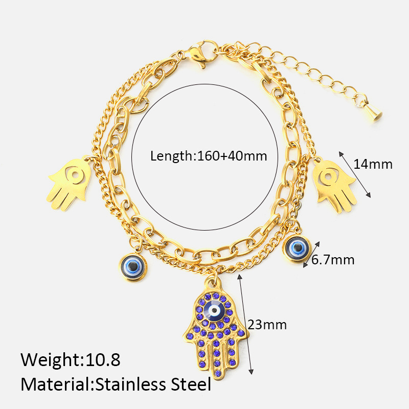 This gold stainless steel evil eye bracelet showcases a meaningful hand charm and layered chain structure, adding modern elegance and protection.