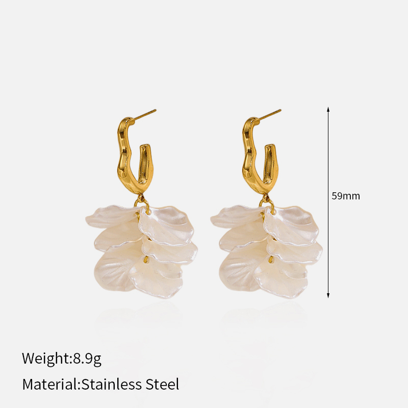 These gold stainless steel flower earrings feature delicate white petal pendants, combining feminine elegance with durable stainless steel for daily wear.