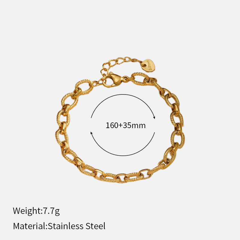 This stainless steel bracelet features a refined rope chain structure with a polished gold finish. As a gold stainless steel chain bracelet for women, it delivers a balance of strength, elegance, and everyday wearability.