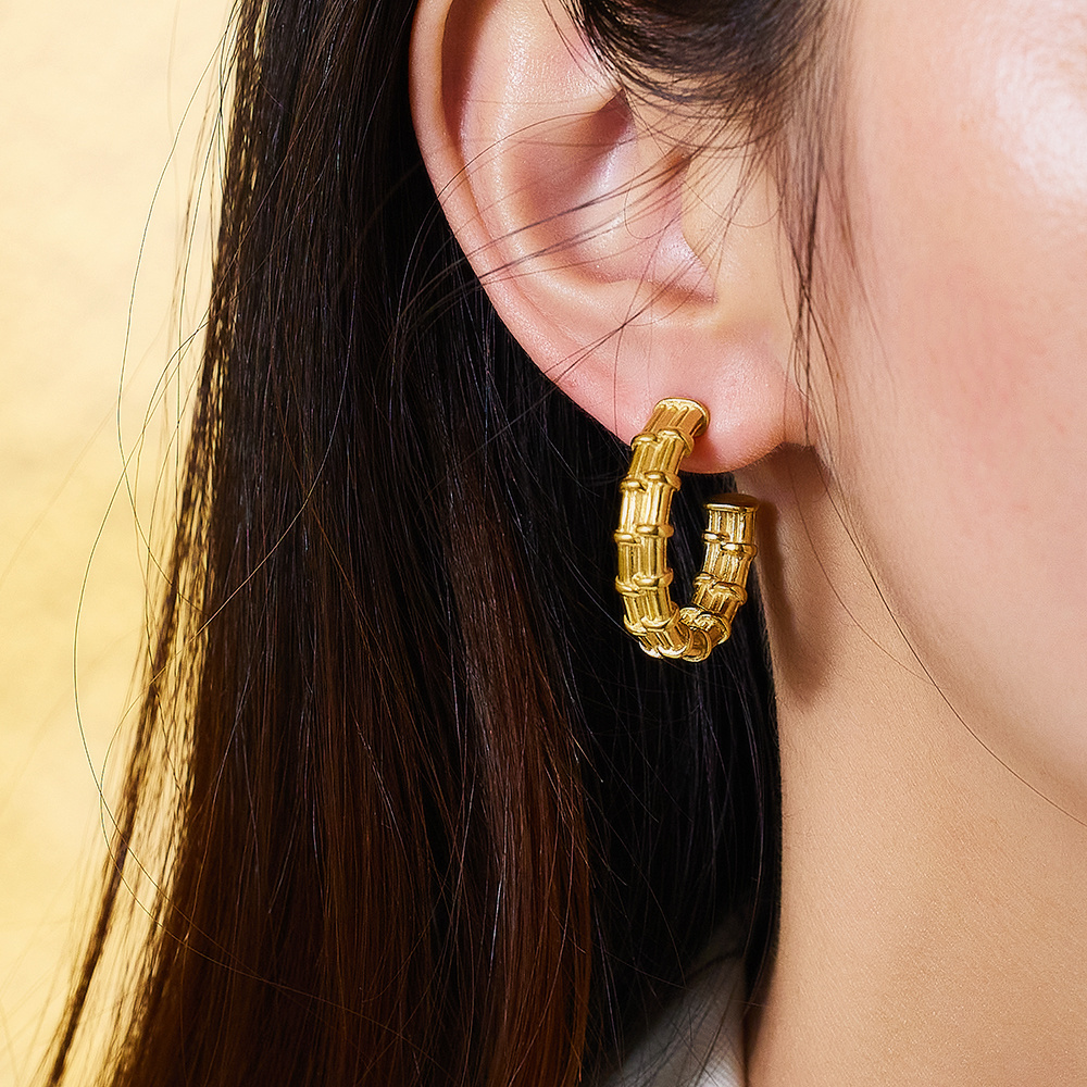 The combination of non-oxidizable golden luster and bamboo joint design presents a unique natural and elegant effect, adding minimalist fashion sense. As a popular natural element, the bamboo joint design is highly versatile, matching casual wear, dresses, shirts and cheongsams. Suitable for ladies of all ages who love natural elegant fashion, it covers a broad consumer base, laying a solid foundation for wholesale. Excellent anti-oxidation performance keeps the earrings looking new for long, improving practicality and repurchase rate. Flexible customization of bamboo joint details based on partners' brand positioning helps form differentiated competition.