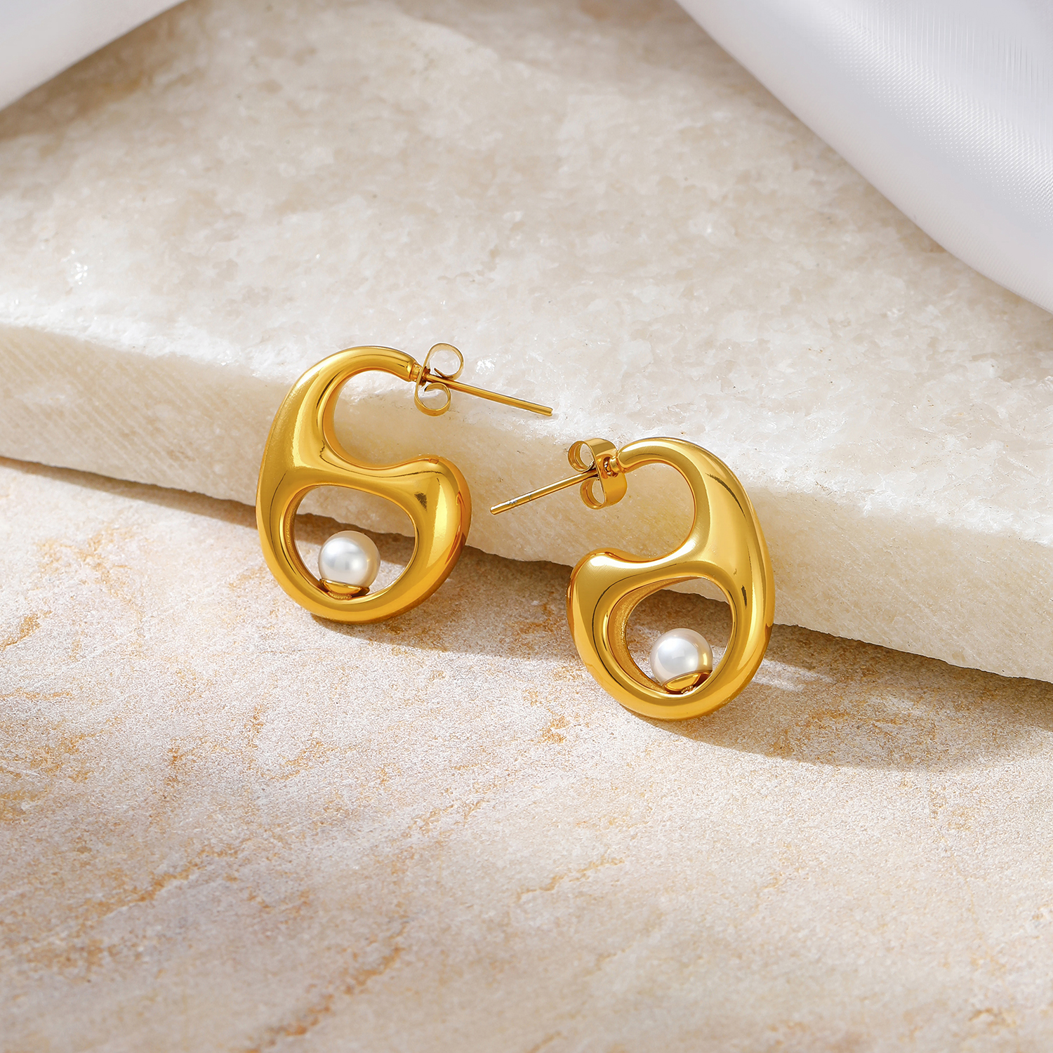 These gold plated stainless steel abstract pearl stud earrings blend minimalist modernity with subtle elegance. The smooth abstract frame and lustrous pearl create lightweight tarnish-resistant gold abstract earrings that stay comfortable all day. Perfect for elevating casual or office looks, they are a standout choice for women’s minimalist earrings.