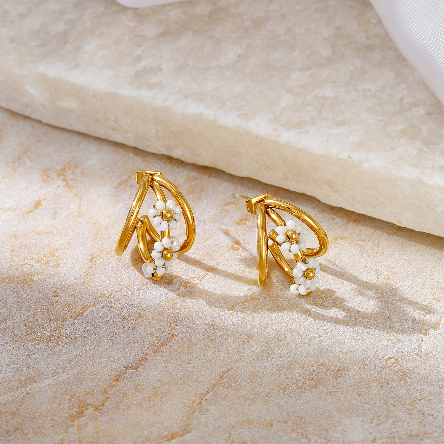 These gold plated stainless steel multi-layer beaded hoop earrings blend minimalist style with delicate texture. The layered gold hoops and clustered white beads create lightweight tarnish-resistant gold beaded earrings that stay comfortable all day. Perfect for elevating casual or office looks, they are a standout choice for women’s minimalist earrings.