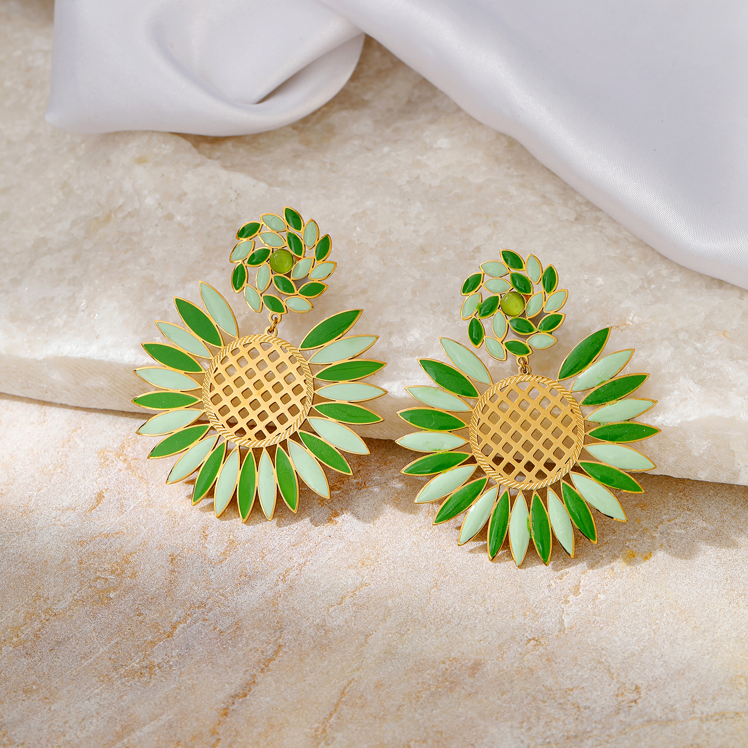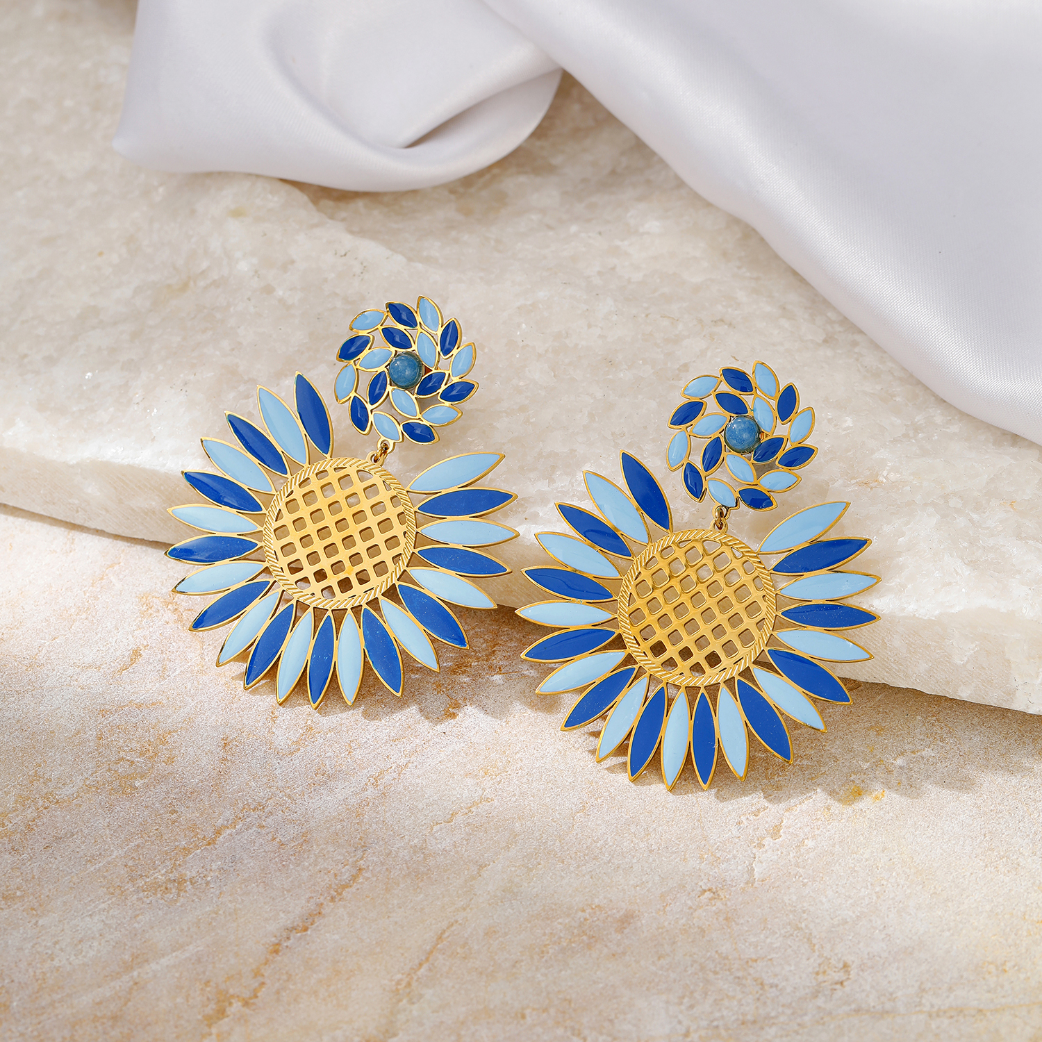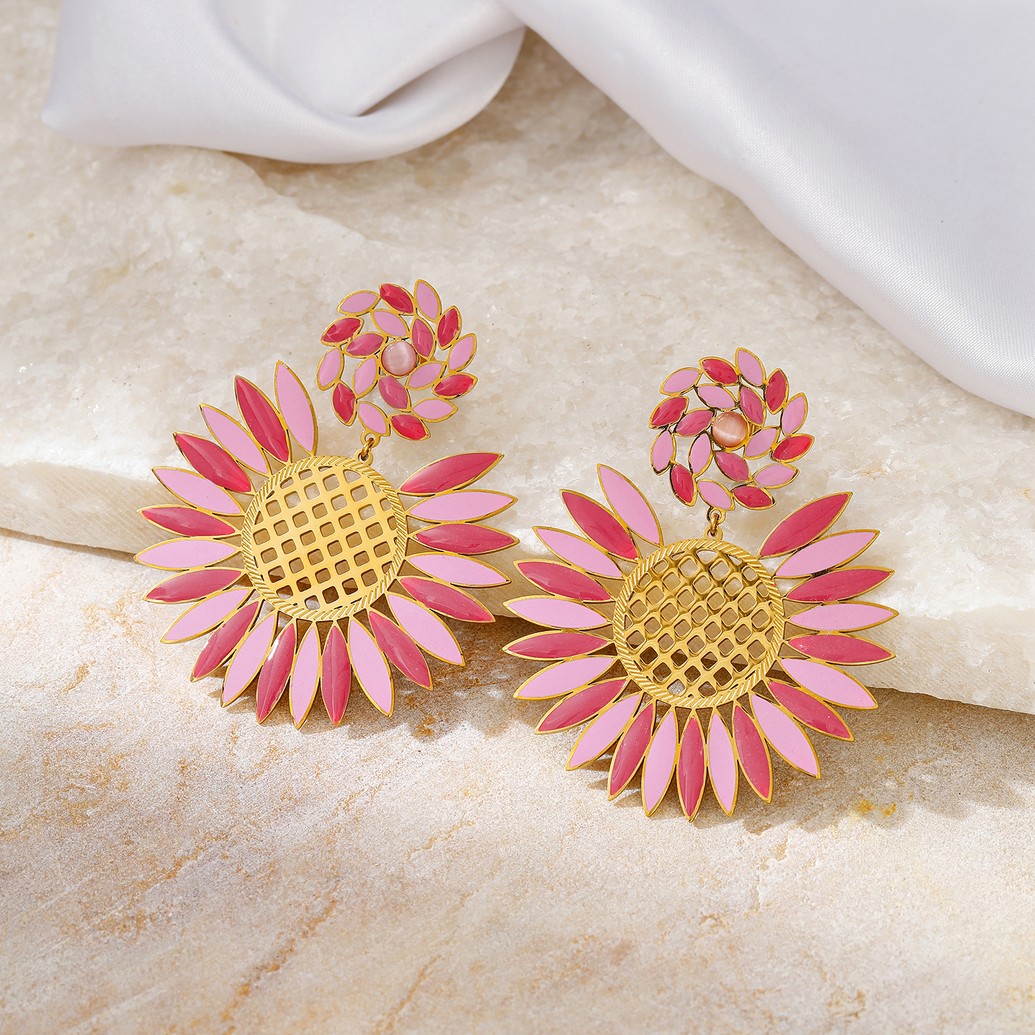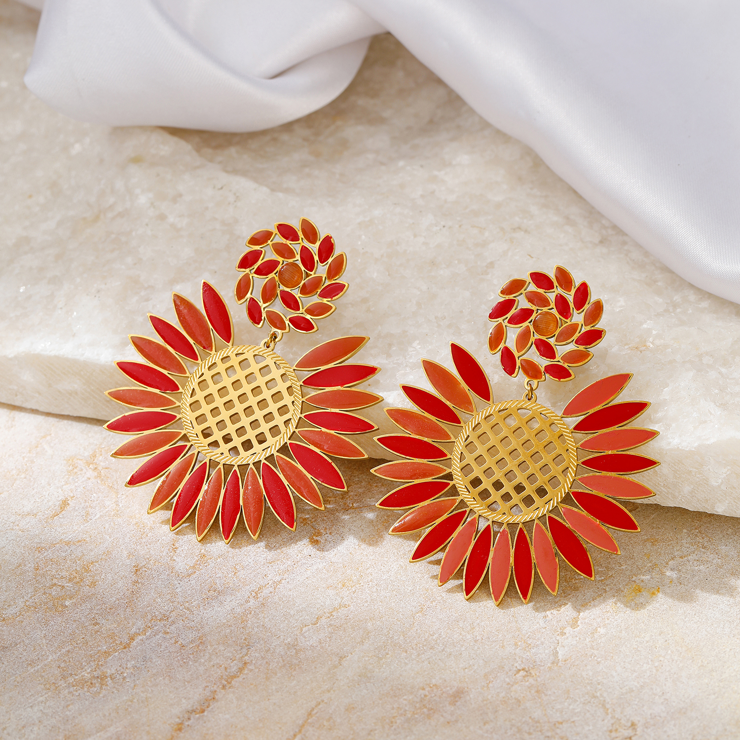 These gold plated stainless steel sunflower enamel drop earrings blend boho charm with vibrant color. The layered enamel petals and textured center create lightweight tarnish-resistant gold enamel earrings that stay comfortable all day. Perfect for elevating casual or vacation looks, they are a standout choice for women’s floral earrings.