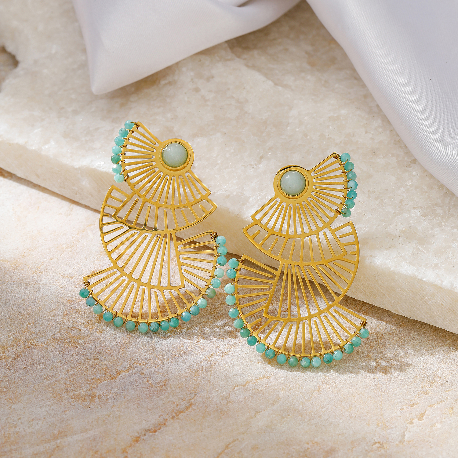 These gold plated stainless steel tiered fan gemstone drop earrings blend bohemian boldness with artisanal detail. The layered fan filigree frame and natural gemstone beads create lightweight tarnish-resistant gold fan earrings that stay comfortable all day. Perfect for elevating casual or vacation looks, they are a standout choice for women’s boho statement earrings.