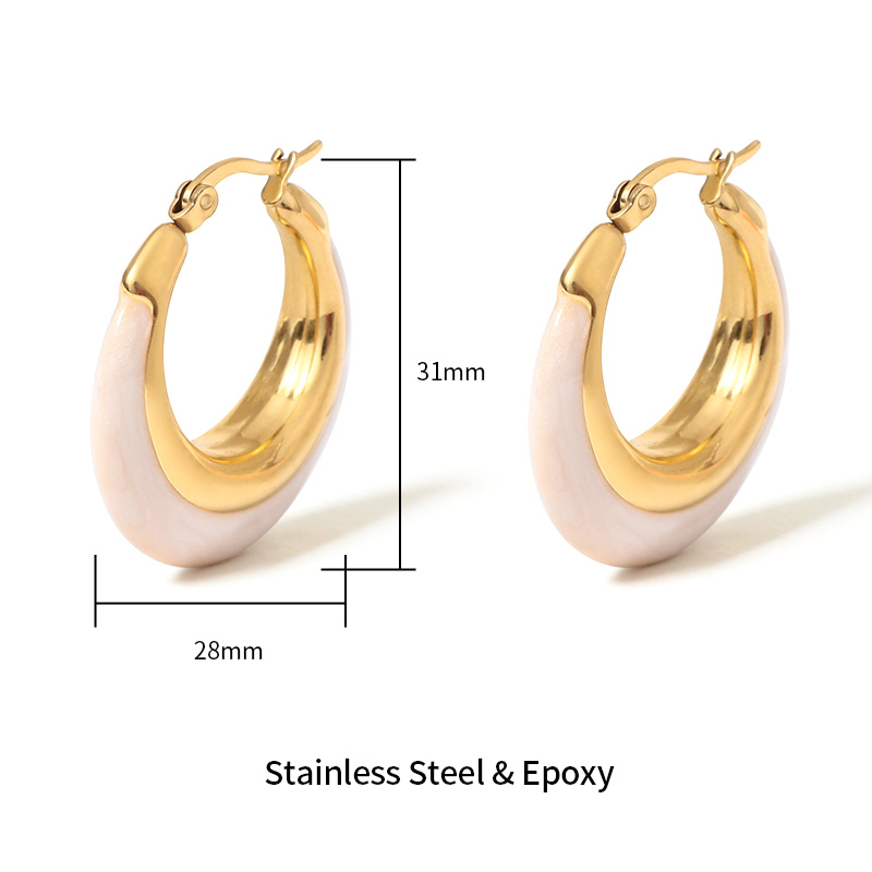 These stainless steel earrings feature a smooth pearl white enamel coating combined with polished metal finish. The classic hoop silhouette delivers a clean and elegant look, making these stainless steel pearl white hoop earrings ideal for modern jewelry collections.