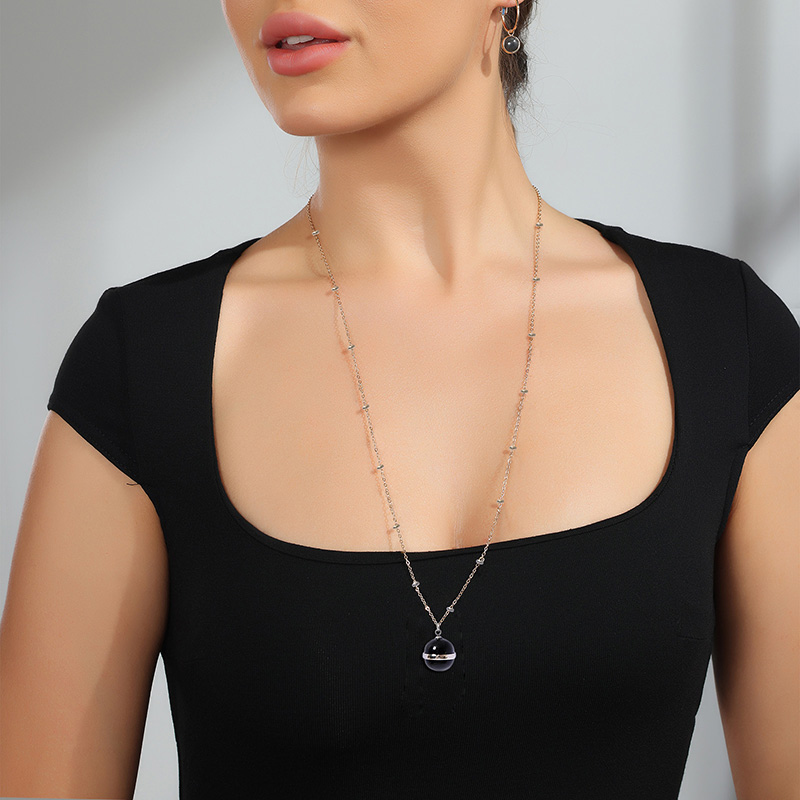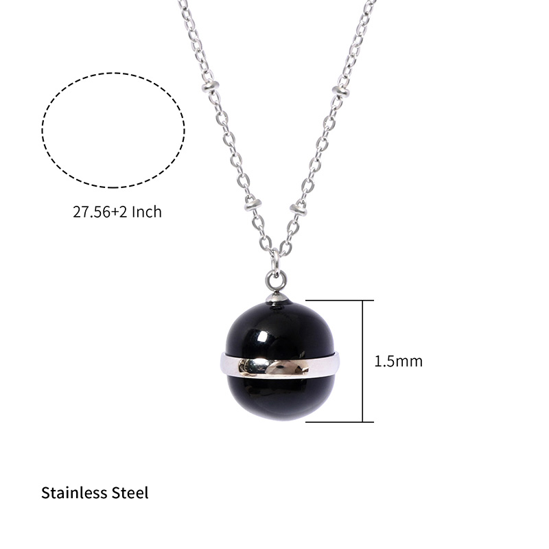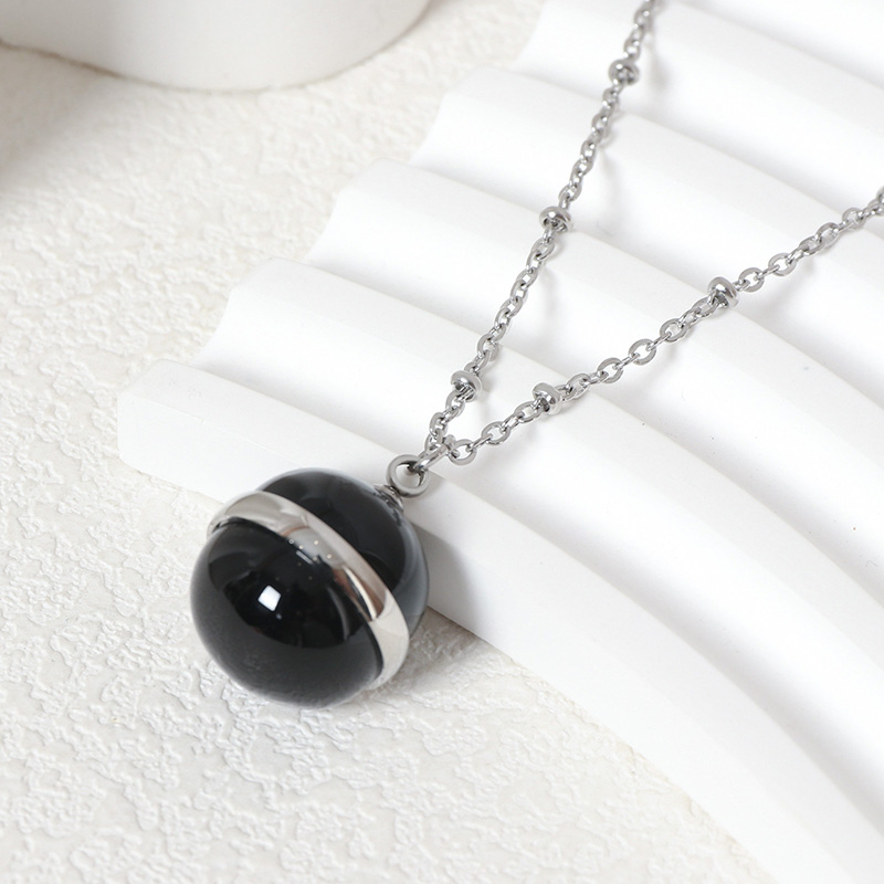 The black agate stone features a smooth surface and deep black tone, creating a minimalist and elegant appearance. It pairs well with the stainless steel chain for a balanced design.