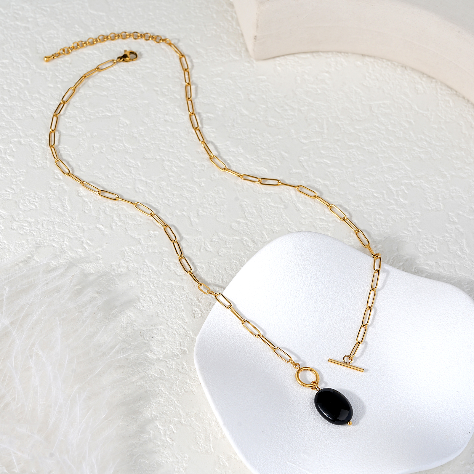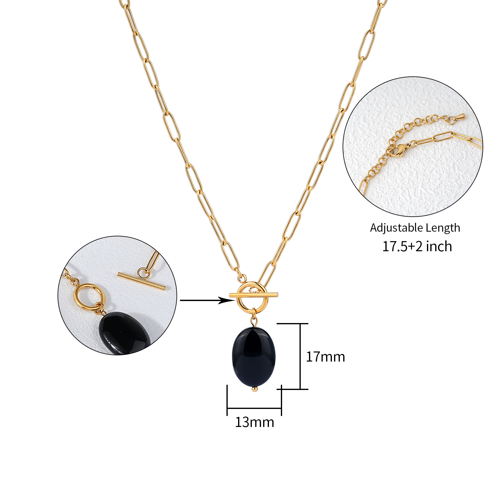 The black agate stone features a smooth finish and deep black tone, creating a minimalist and elegant appearance that enhances the overall necklace design.