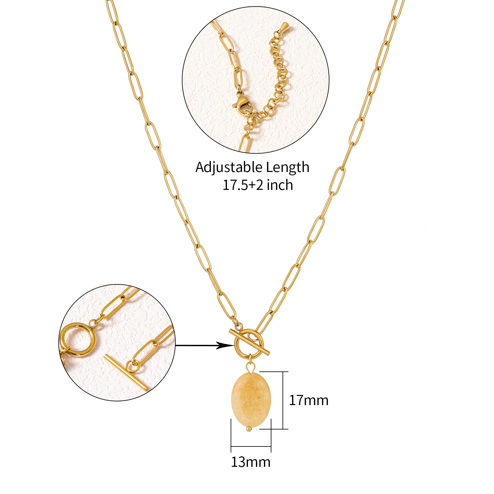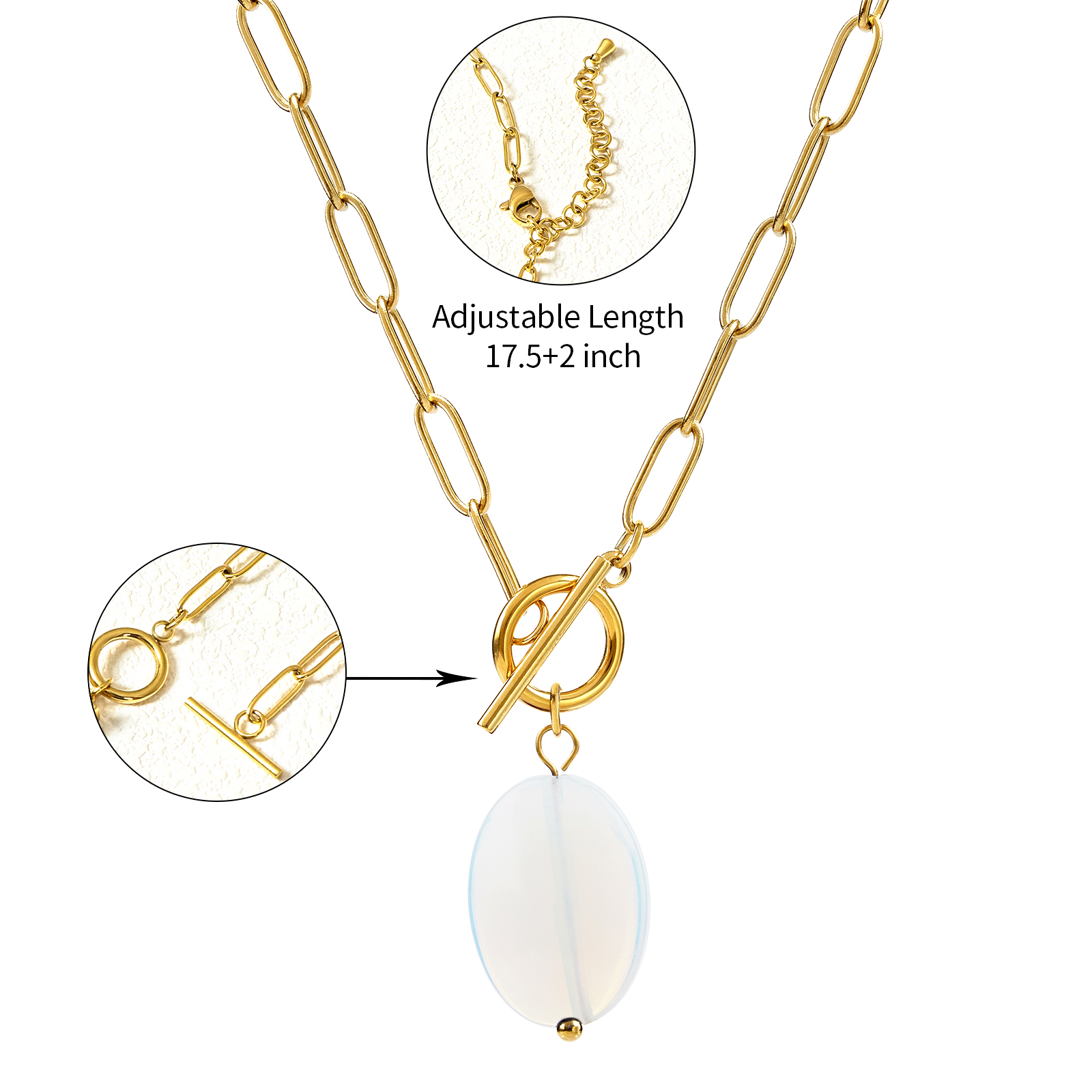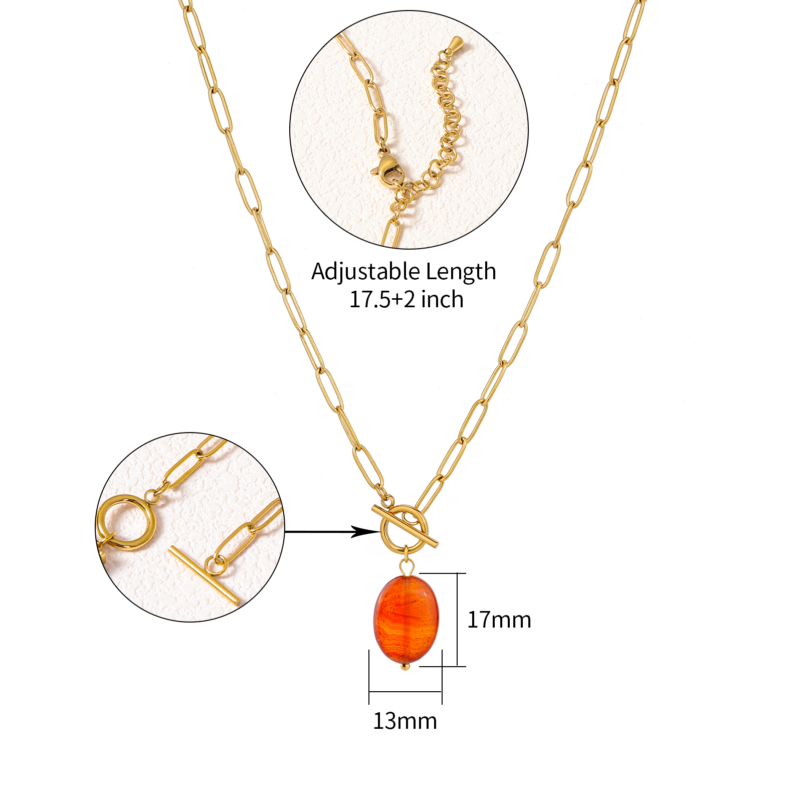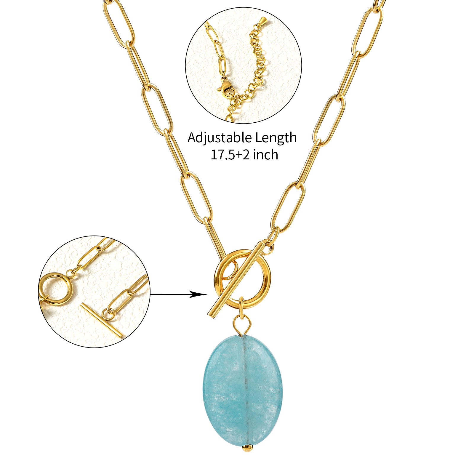 The necklace includes a detachable OT clasp and an adjustable chain length of 45 cm plus 5 cm extension, providing flexibility for different styling and market preferences.