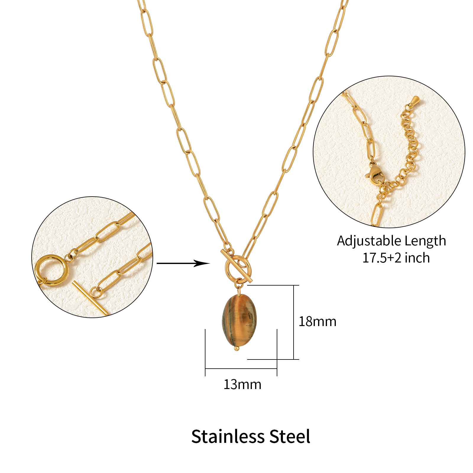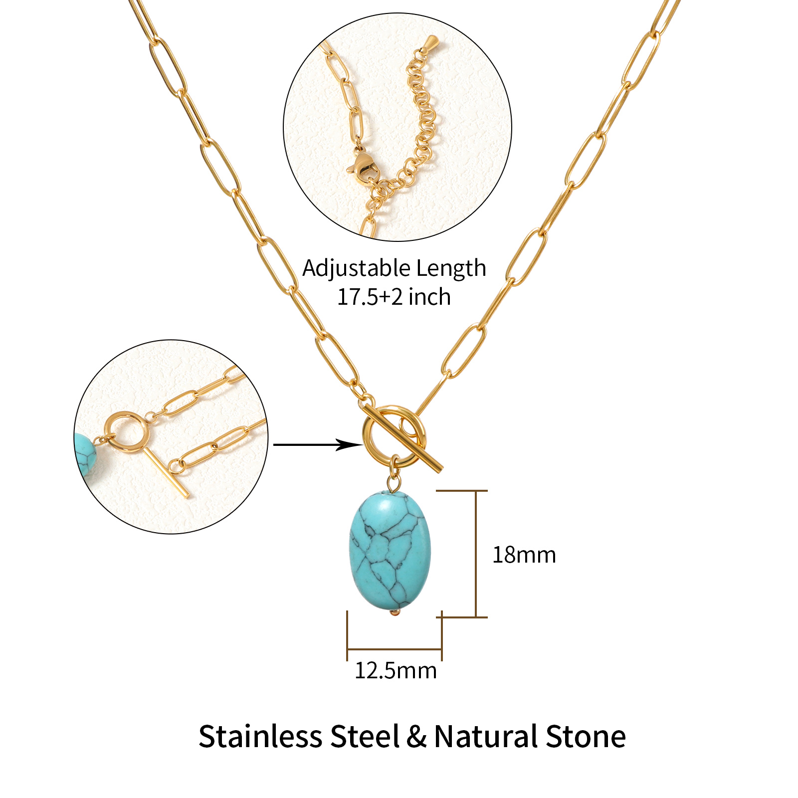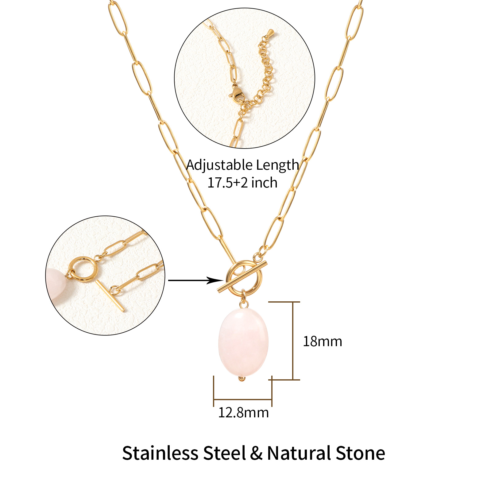 The necklace includes a detachable OT clasp and an adjustable chain length of 45 cm plus 5 cm extension, providing flexibility for different styling and market preferences.