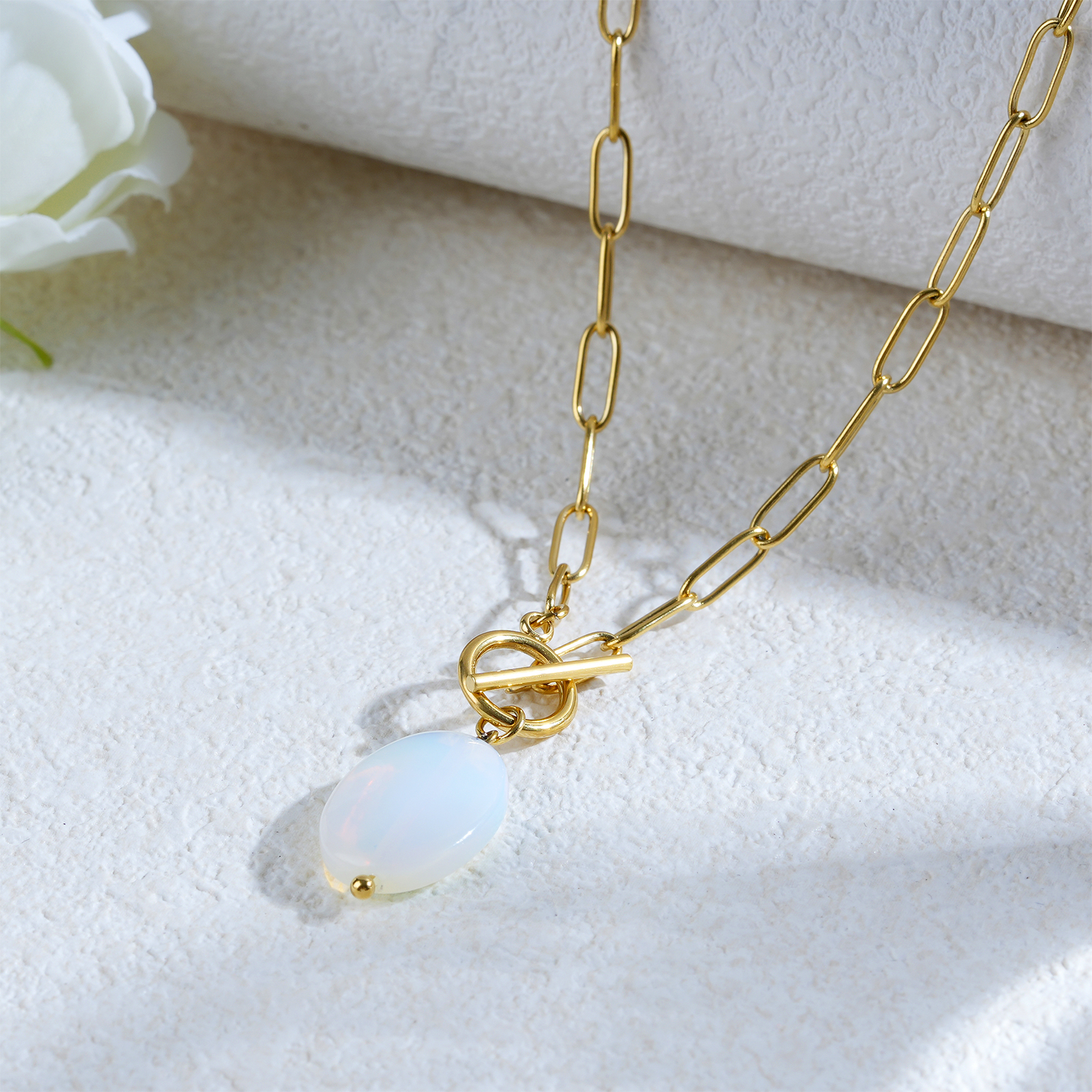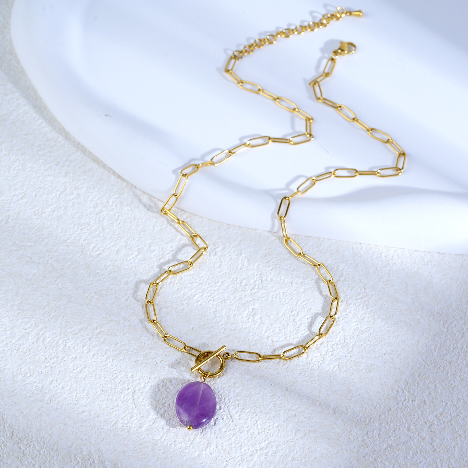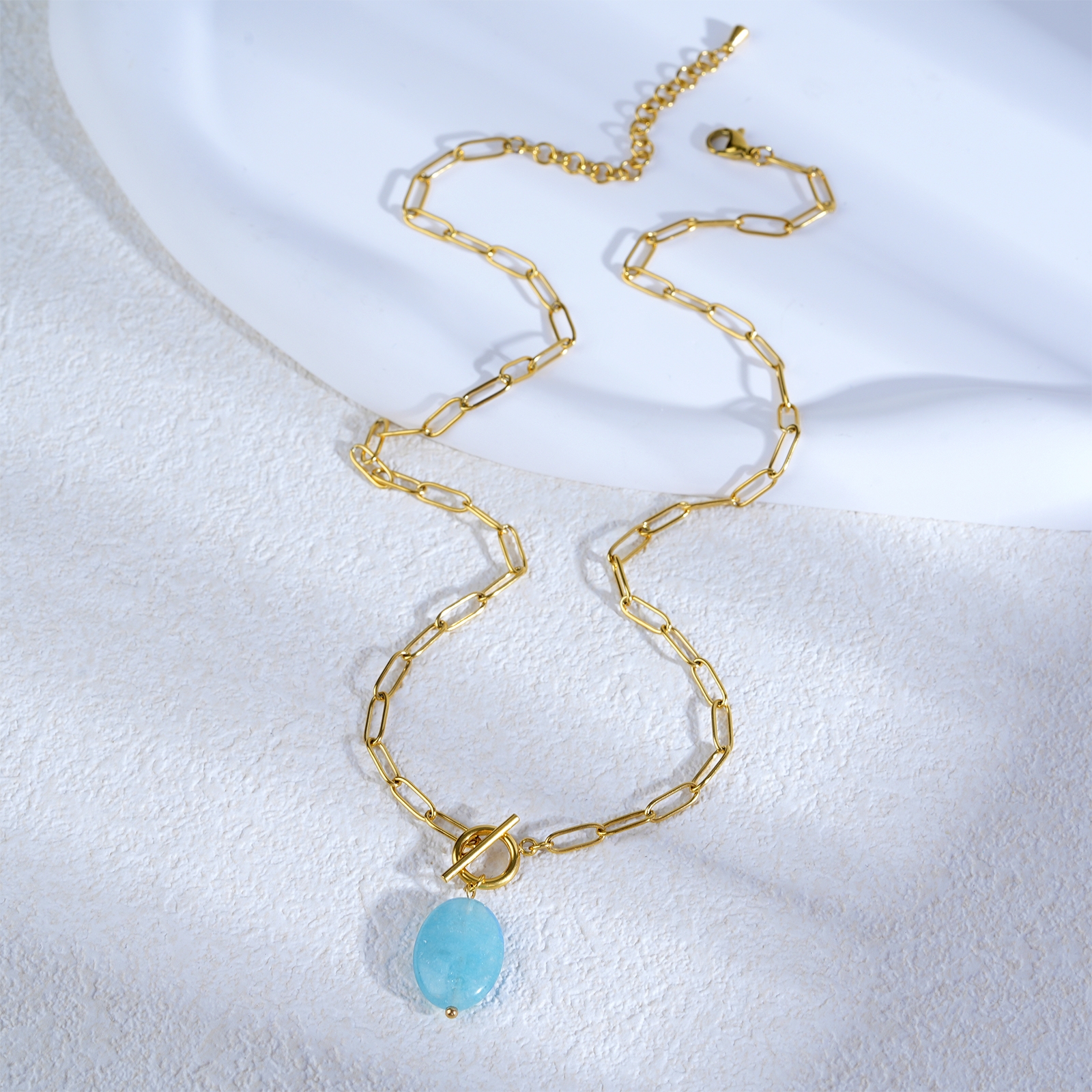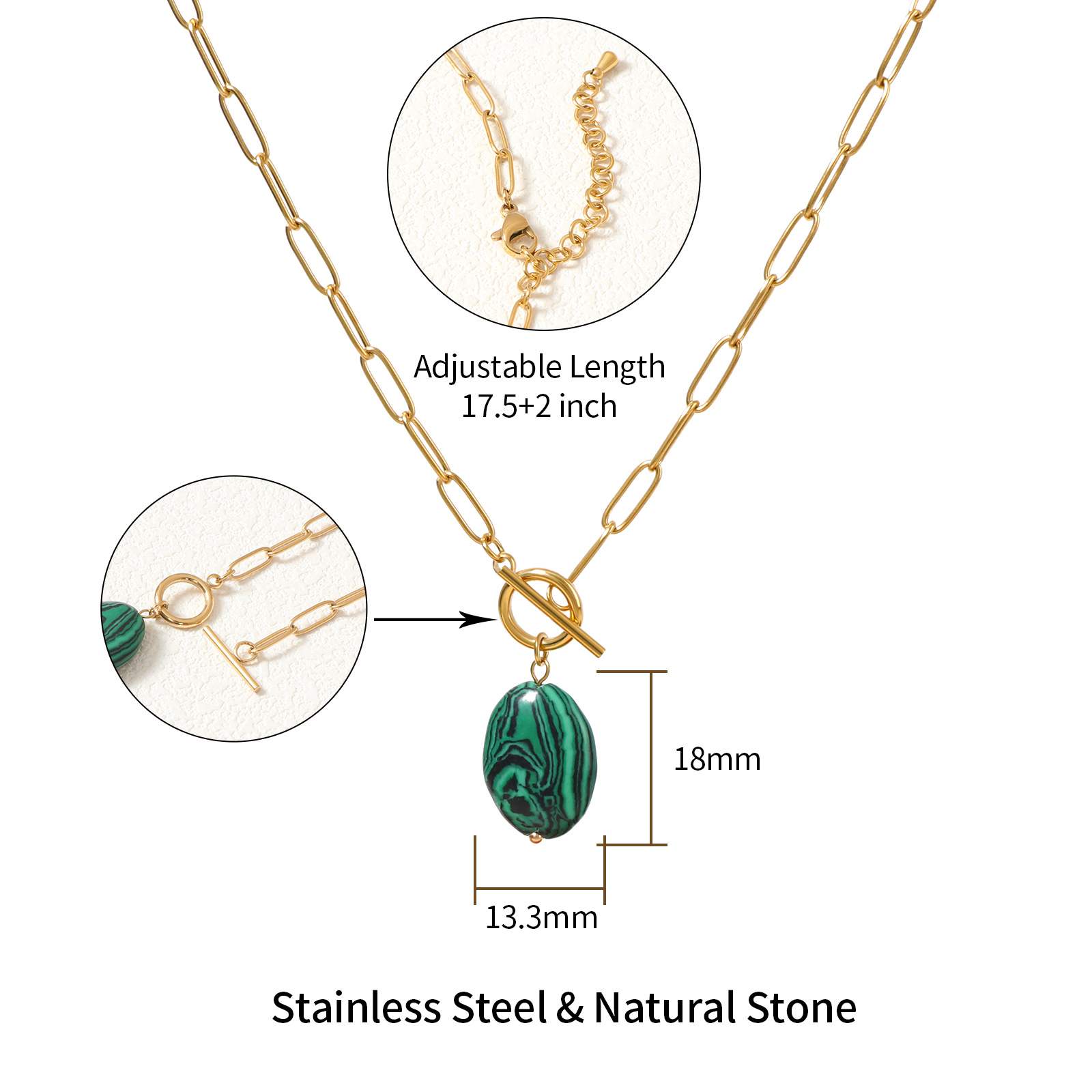 The necklace includes a detachable OT clasp and an adjustable chain length of 45 cm plus 5 cm extension, providing flexibility for different styling and market preferences.