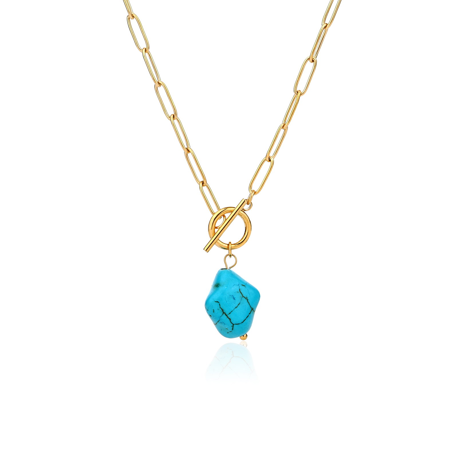The turquoise stone features a natural texture and vibrant color, adding a fresh and distinctive look to the stainless steel necklace design.